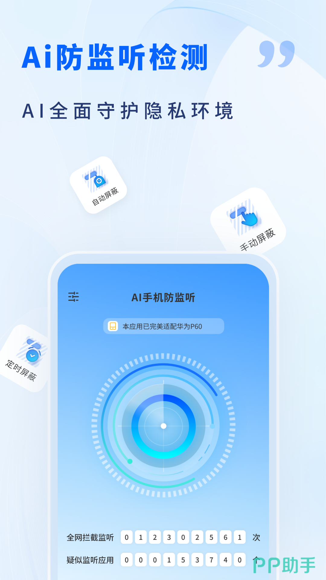 软件本身拥有先进AI数据加密和防窃听技术,以及独有安全扫描引擎,开启之后可以快速进行扫描,找到所有正在后台监听软件,然后进行一键屏蔽。这样能最大限度降低被泄露可能性,尤其是和私密对话和机密会议等重要场合使用。