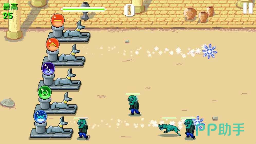 以我们所熟悉的僵尸角色作为主要的防御敌人,他以像素的风格为大家展示了一个魔幻的塔防世界,玩家所扮演的便是一名魔法师的角色通过手指在屏幕上的绘制和点击释放出魔法,对抗汹涌澎湃的僵尸潮。红色的魔法和绿色的魔法是不同的法术类型,红色的魔法是能够对单个僵尸造成很高伤害的。