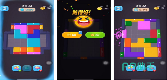 在经典华容道的玩法上又进行全新升级,将会看到各种色彩缤纷的方块核心的任务就是需要正确放置方块的方式,填满整行就能快速消除,在规定的时间之内,需要达到目标的分数要求,其中还提供三种不同的道具,比如刷新或者是提示等等。