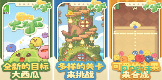 采用清新明快的视觉风格,整体氛围轻松治愈。玩家需通过逐级合成水果达成核心目标——最终合成大西瓜。关卡中,屏幕顶部持续下落基础水果(如小蓝莓),两颗相同水果接触后自动升级为更高阶水果(例如蓝莓→草莓),层层递进,直至生成大西瓜以获取高额积分,并解锁更具挑战性的后续关卡。