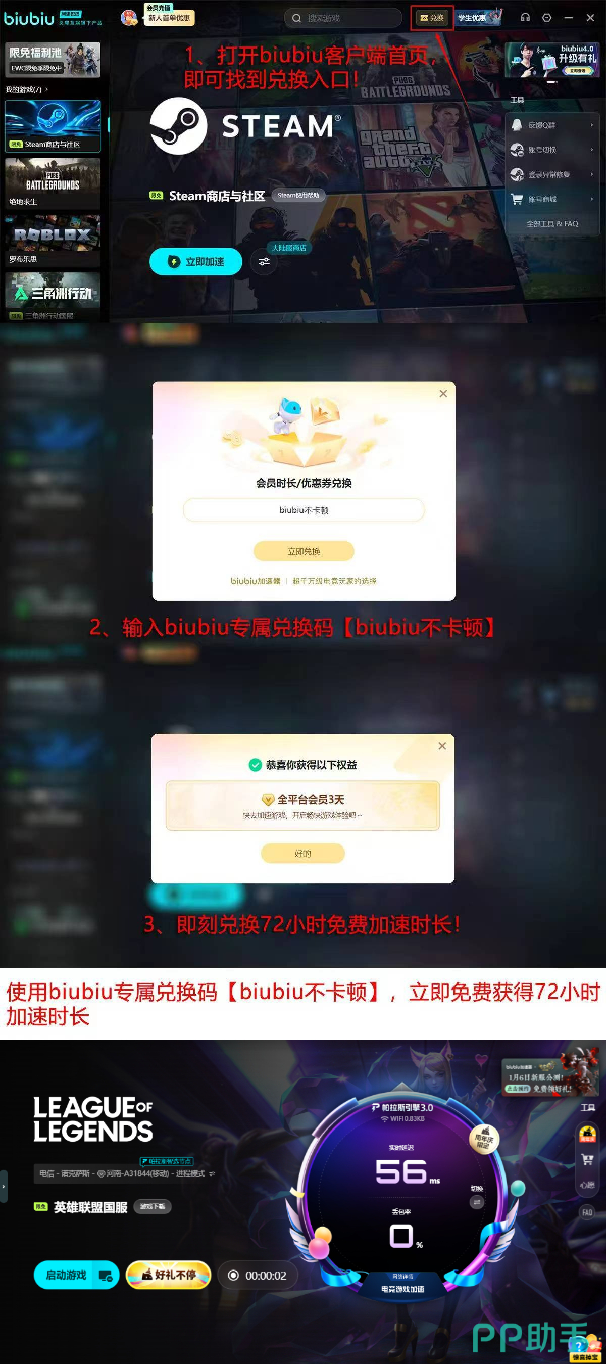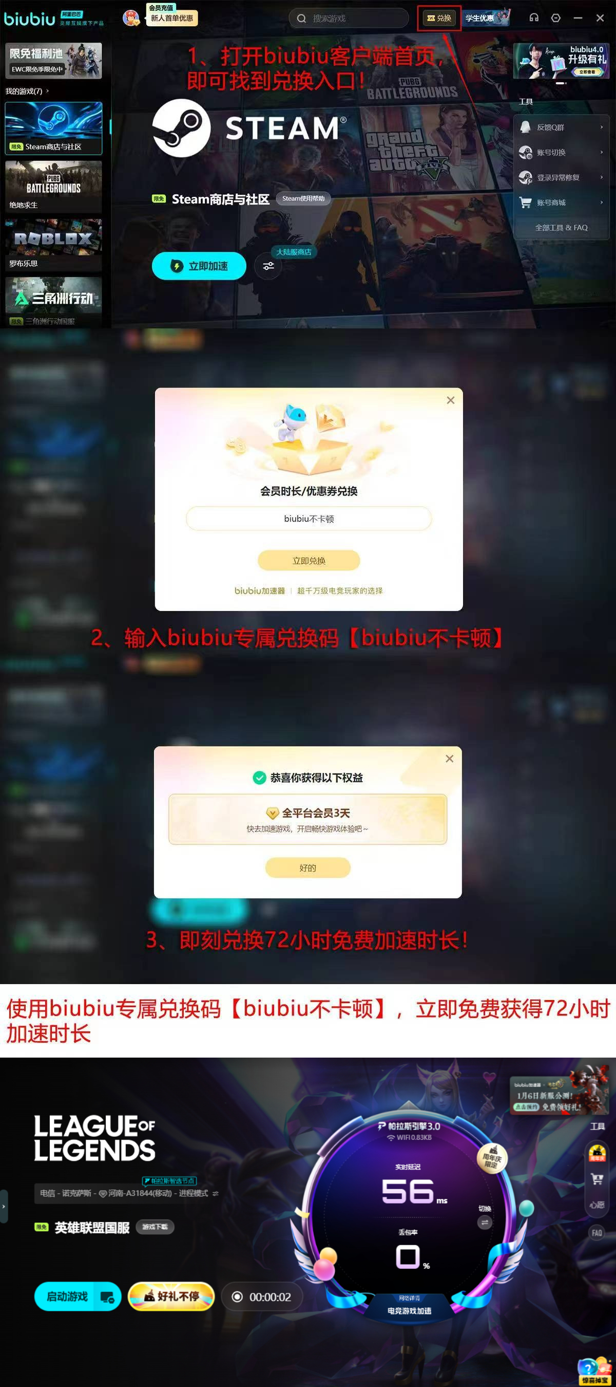 为帮助新玩家快速建立流畅体验认知,biubiu加速器现面向全体用户开放限时体验权益:即日起注册账号,即可解锁首日24小时全功能免费使用权;输入激活码【biubiu不卡顿】,额外获得72小时进阶加速权限,累计可享总计96小时无限制电竞级加速服务。
