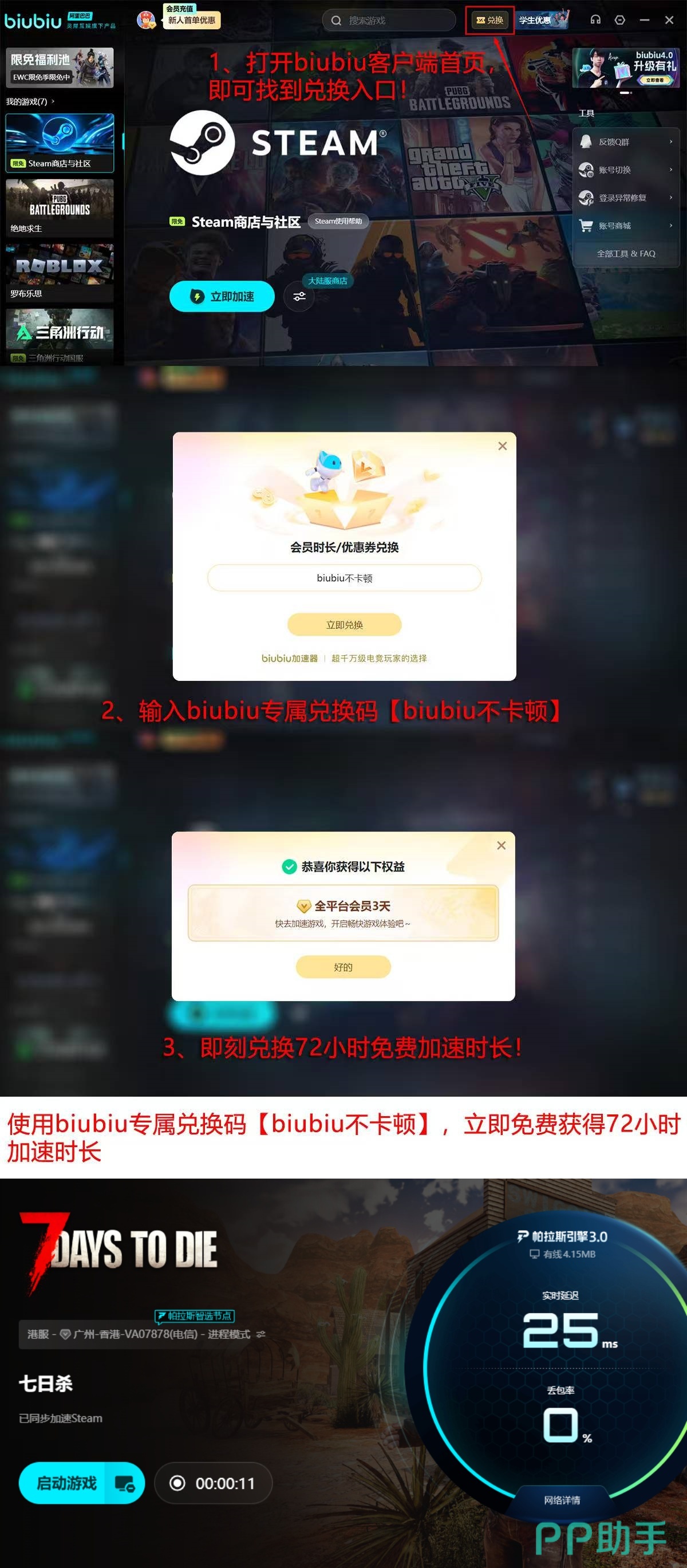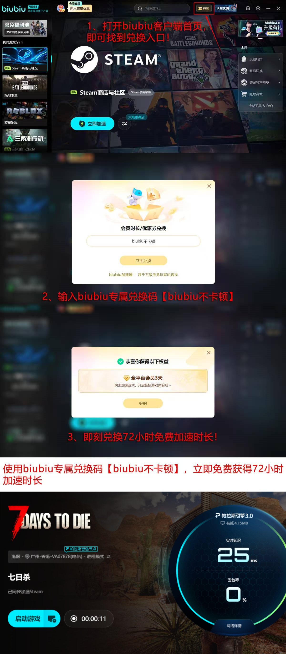针对新注册用户,平台现开放专项体验权益:首次登录即可领取24小时全节点免费加速时长;另输入专属兑换码【biubiu不卡顿】,还可额外激活3天连续加速权限,两项福利叠加后,总计可享96小时无限制加速服务。