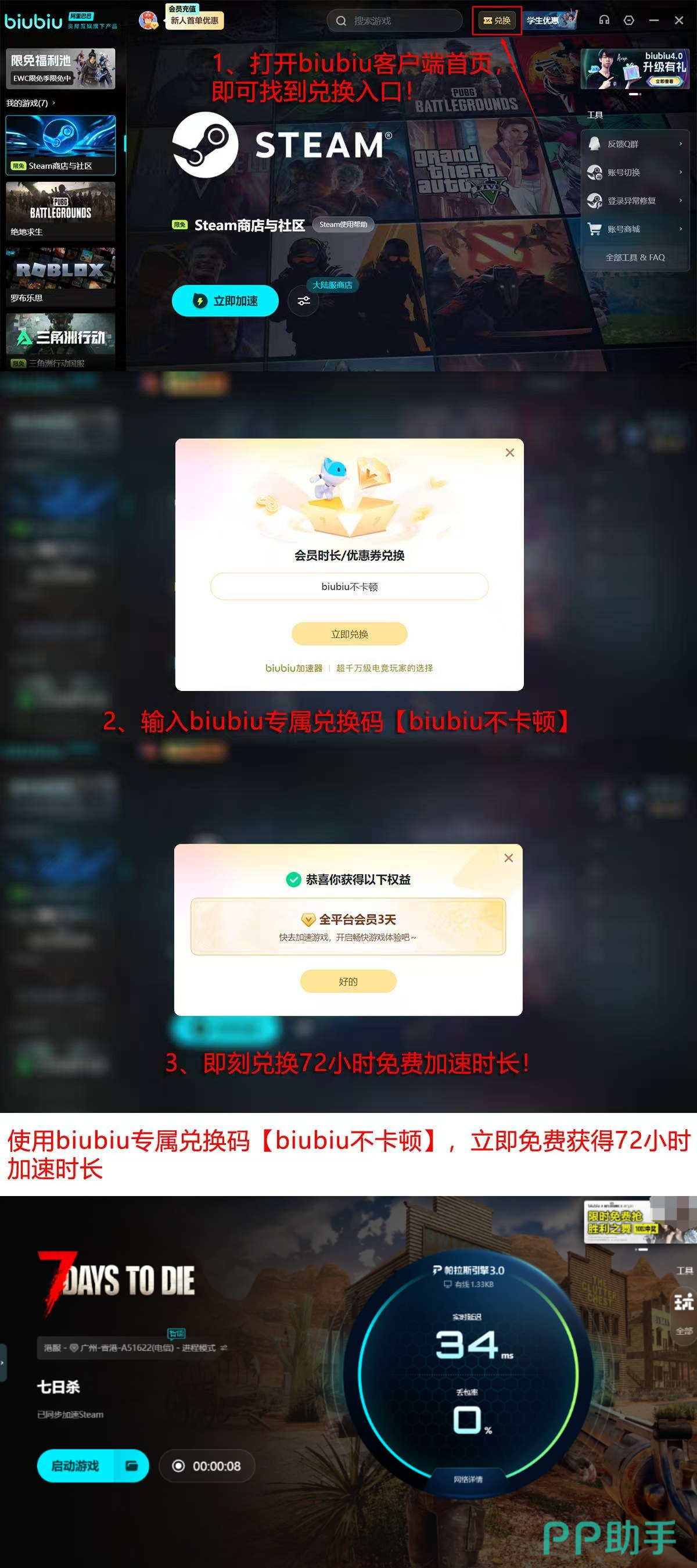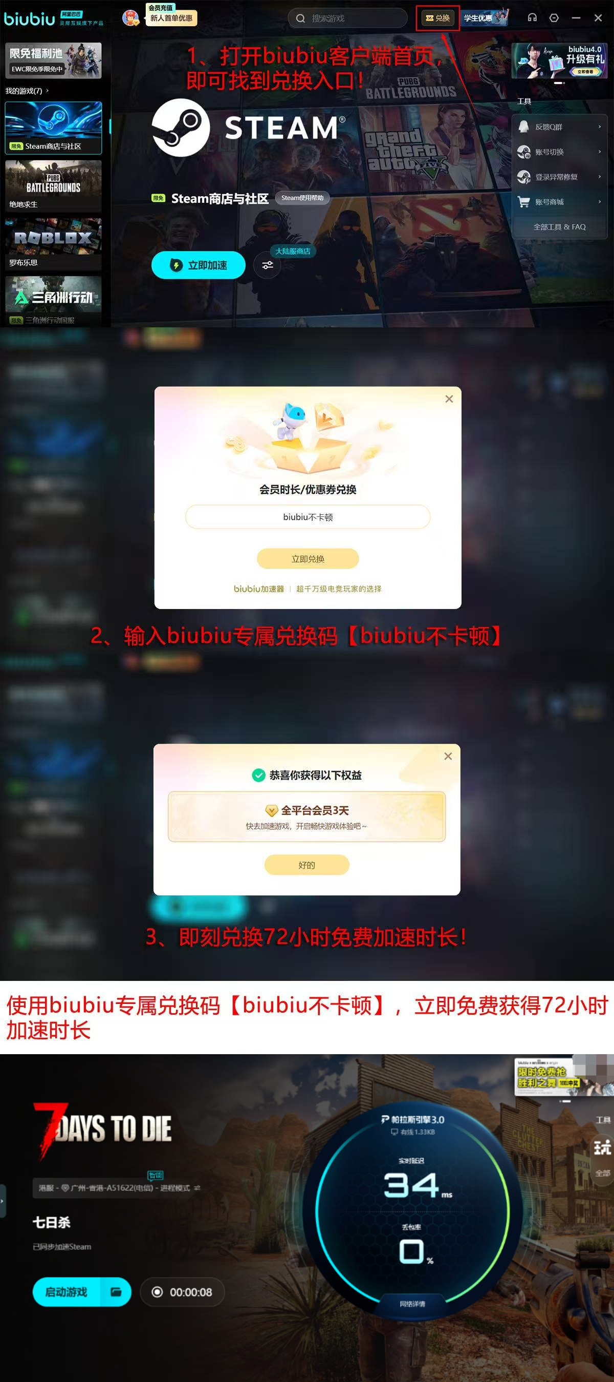 新注册用户开通biubiu加速器账户后,即可立即启用24小时全功能免费试用权限;若在激活界面输入专属口令【biubiu不卡顿】,还可额外获赠72小时加速时长。综合计算,首次使用的玩家最高可累计享受96小时无限制加速服务。