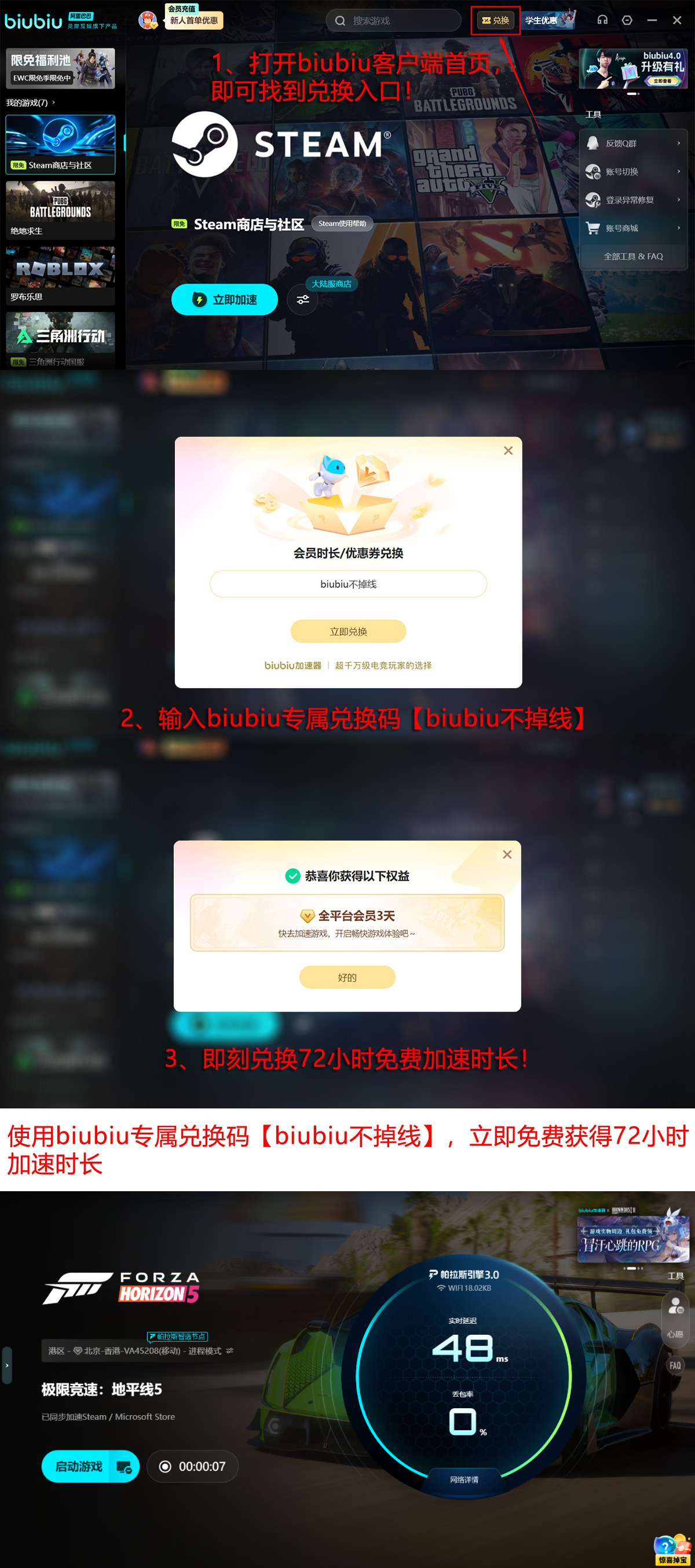 新用户注册后可立即解锁24小时全功能试用权限;在激活界面输入专属口令【biubiu不掉线】,还可额外延长72小时稳定加速服务。两项权益叠加,总计可获得96小时无中断高性能运行支持。