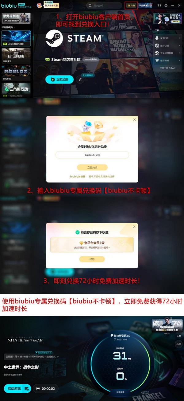 新用户注册后可自动获得24小时全功能免费试用权限。若需延长体验周期,可在客户端内输入口令“biubiu不卡顿”,即可额外兑换3天全平台高级会员权益。两项叠加后,总计可享96小时无限制加速服务,充分覆盖《中土世界:暗影之战》全流程体验所需。