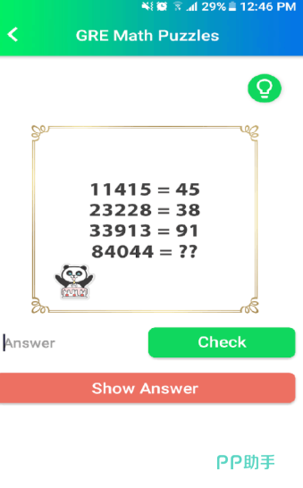 专为备考群体及高阶逻辑玩家打造,题目严格对标GRE Quantitative Reasoning模块常见题型,包括数据解释、数量比较、应用建模等。界面采用极简黑白风格,支持中英双语切换;内置熊猫助手提供阶段性提示,兼顾挑战性与学习友好度。40+原创谜题层层递进,强调快速识别题干关键信息与反向推演能力。