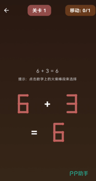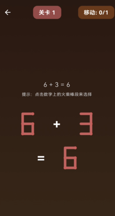 经典火柴棒谜题数字化还原作品。所有算式均由可移动火柴构成,玩家通过增删、平移、旋转火柴改变数字形态或运算符,使等式成立。题目涵盖数字变形(如将“6”改为“9”)、符号修正(“+”变“−”)、等式重构(调整左右两边数值)三大类型,共设120道原创关卡,难度梯度清晰。