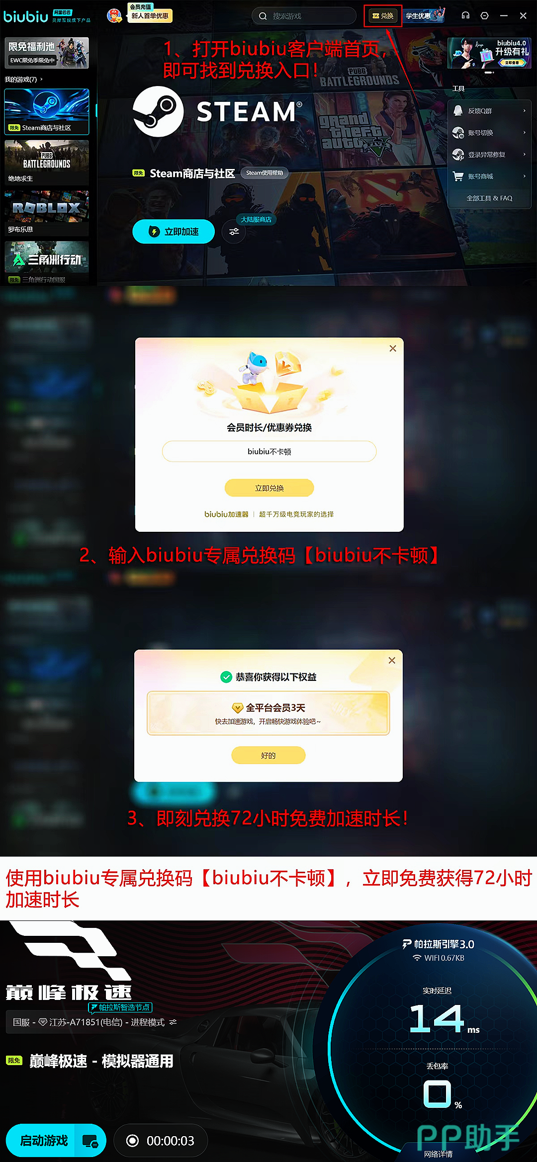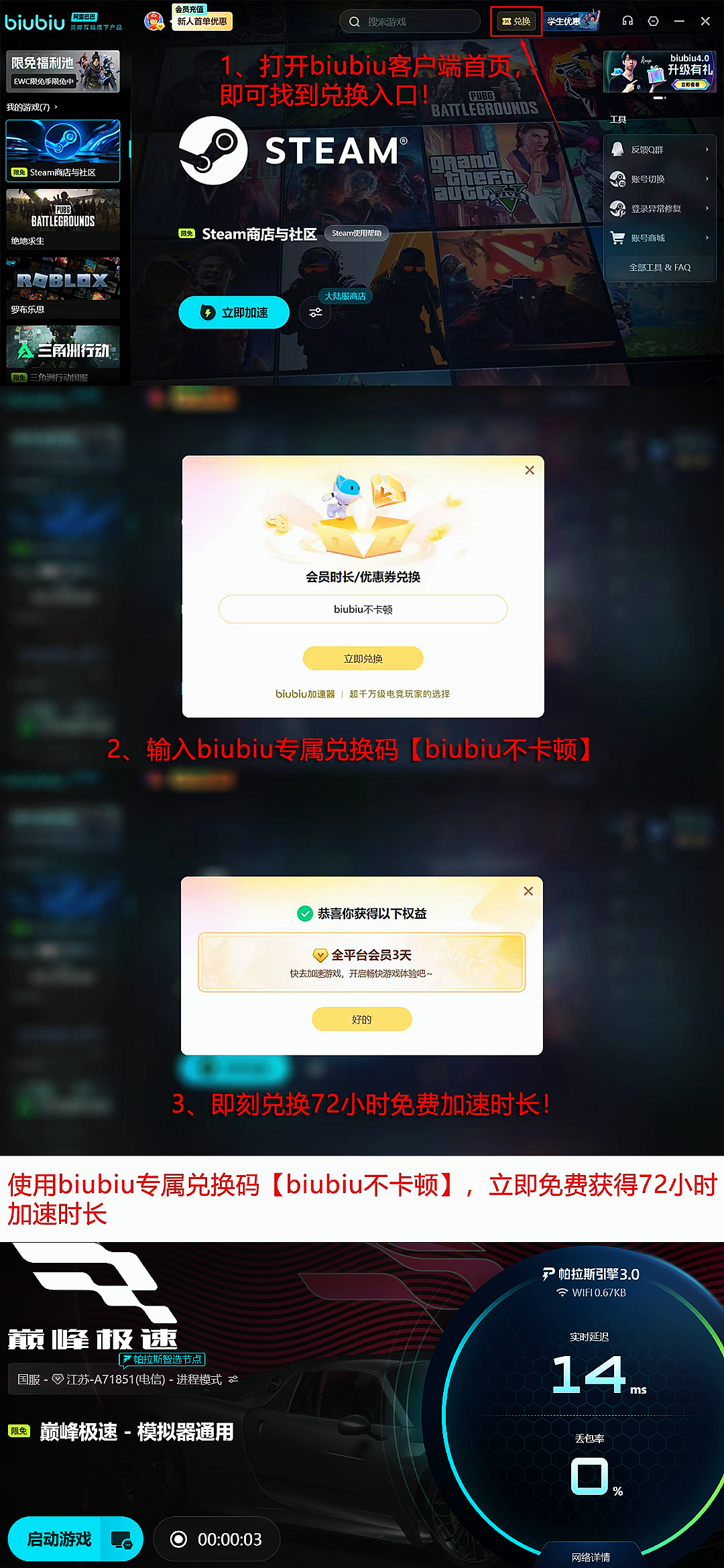 在功能迭代基础上,biubiu同步升级用户权益体系:新注册用户可即时领取24小时全游戏免费加速时长;所有用户输入兑换码【biubiu不卡顿】,还可额外获赠3天无限制加速服务。