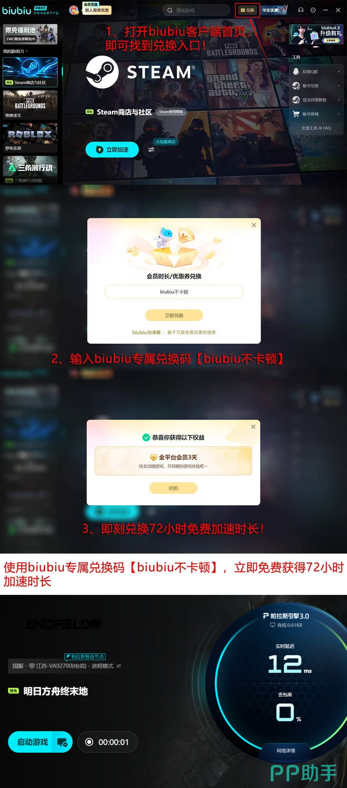 新用户注册即享24小时全功能免费试用;输入专属兑换码“biubiu不卡顿”,还可额外激活72小时基础加速服务,合计可连续使用4天高强度网络优化支持,全面覆盖日常通勤、夜间高峰及跨区域联机等典型弱网场景。
