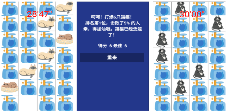 该作沿用经典“点击打击”交互范式,玩法机制类似传统打地鼠。猫咪随机从屏幕各区域弹出,玩家需在限定时间内精准点击完成击打。反馈系统包含物理震动、动态特效及真实猫叫采样,显著提升操作沉浸感。角色设计覆盖多种毛色与神态组合,密集出现时形成强烈的萌系视觉冲击,兼具解压效果与娱乐性。