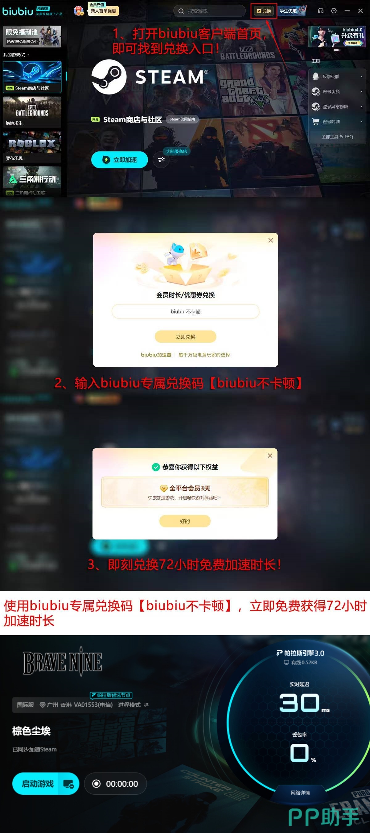 新用户注册后可立即领取24小时全功能免费加速时长;输入专属兑换码【biubiu不卡顿】,还可额外激活3天连续加速权益,累计享96小时无限制加速服务,覆盖新手成长关键期。