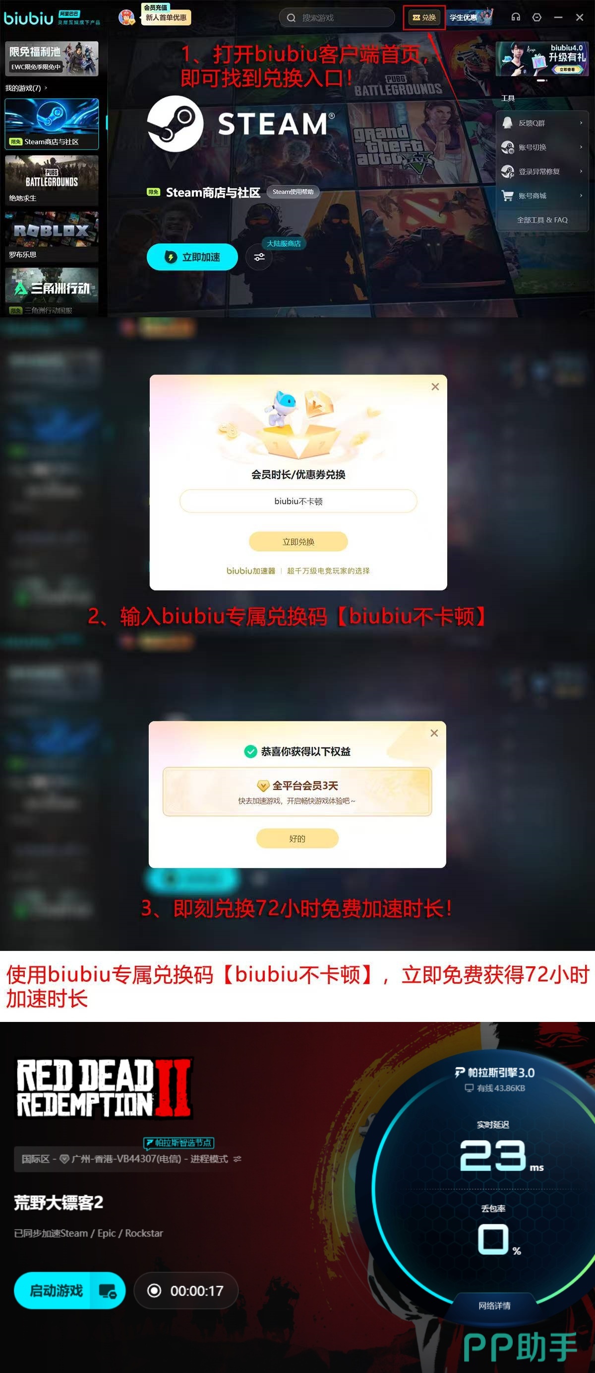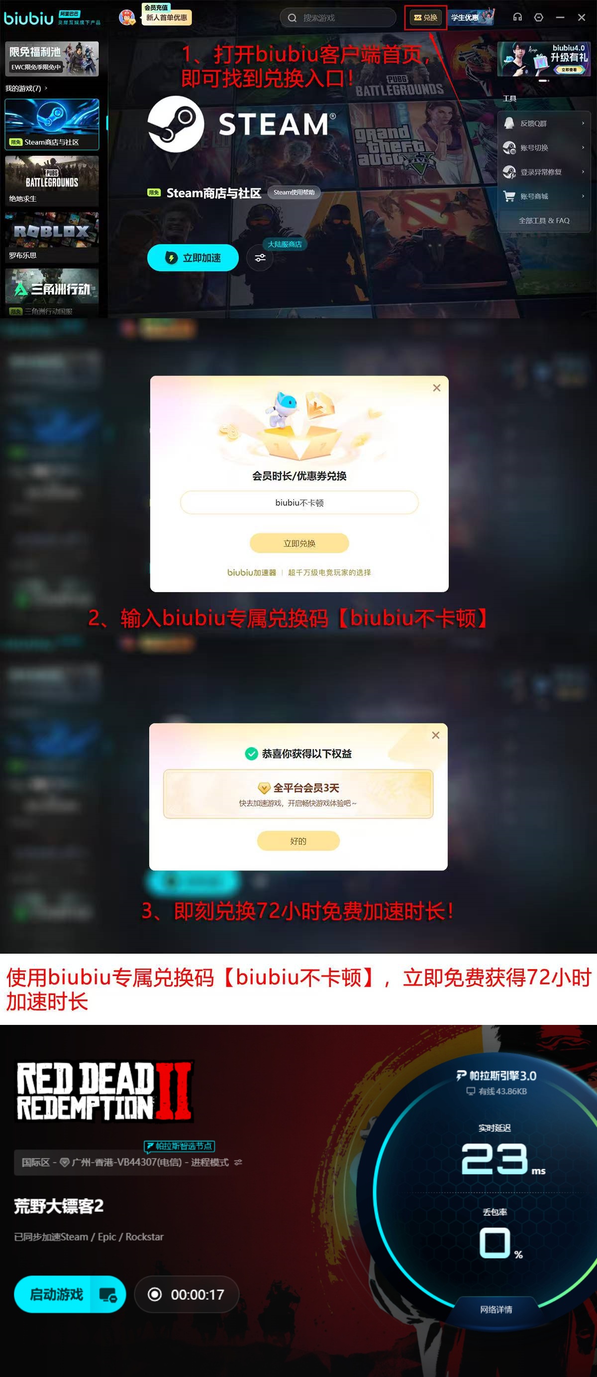 目前,biubiu加速器面向新用户推出限时体验计划:注册后即可免费获得24小时全功能加速权限;输入专属兑换码【biubiu不卡顿】,还可额外领取3天加速时长。两项权益叠加后,新用户总计可享96小时无限制加速服务,充分满足《荒野大镖客2》单次通关或长期联机所需。