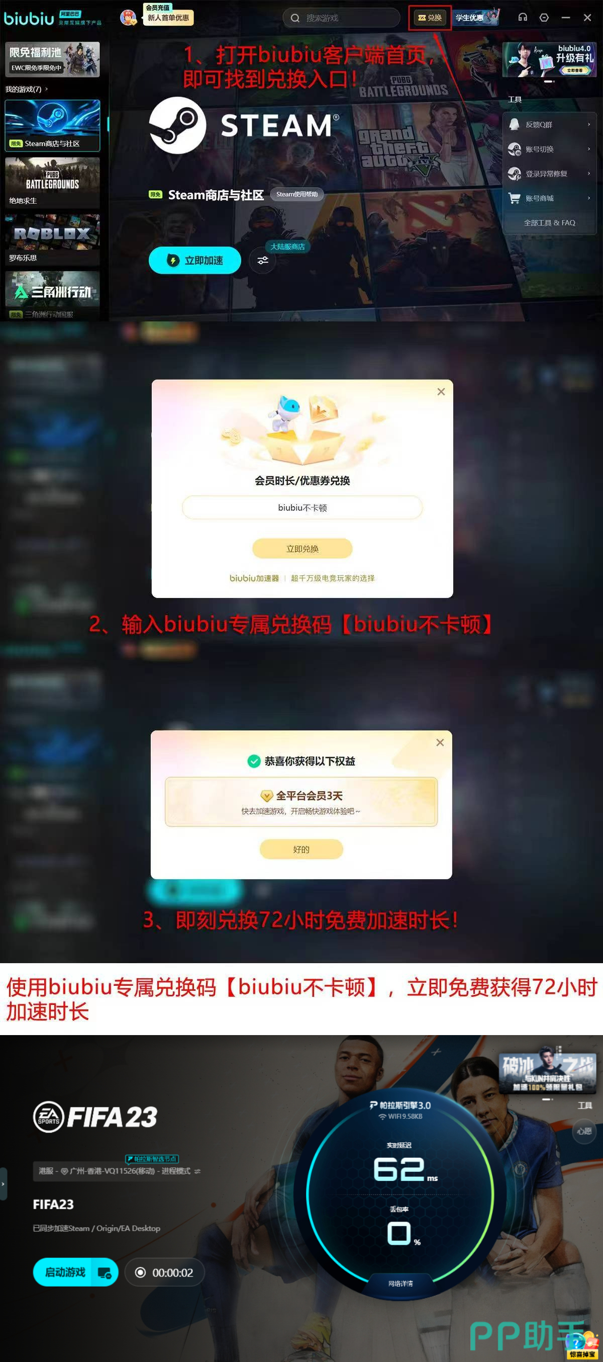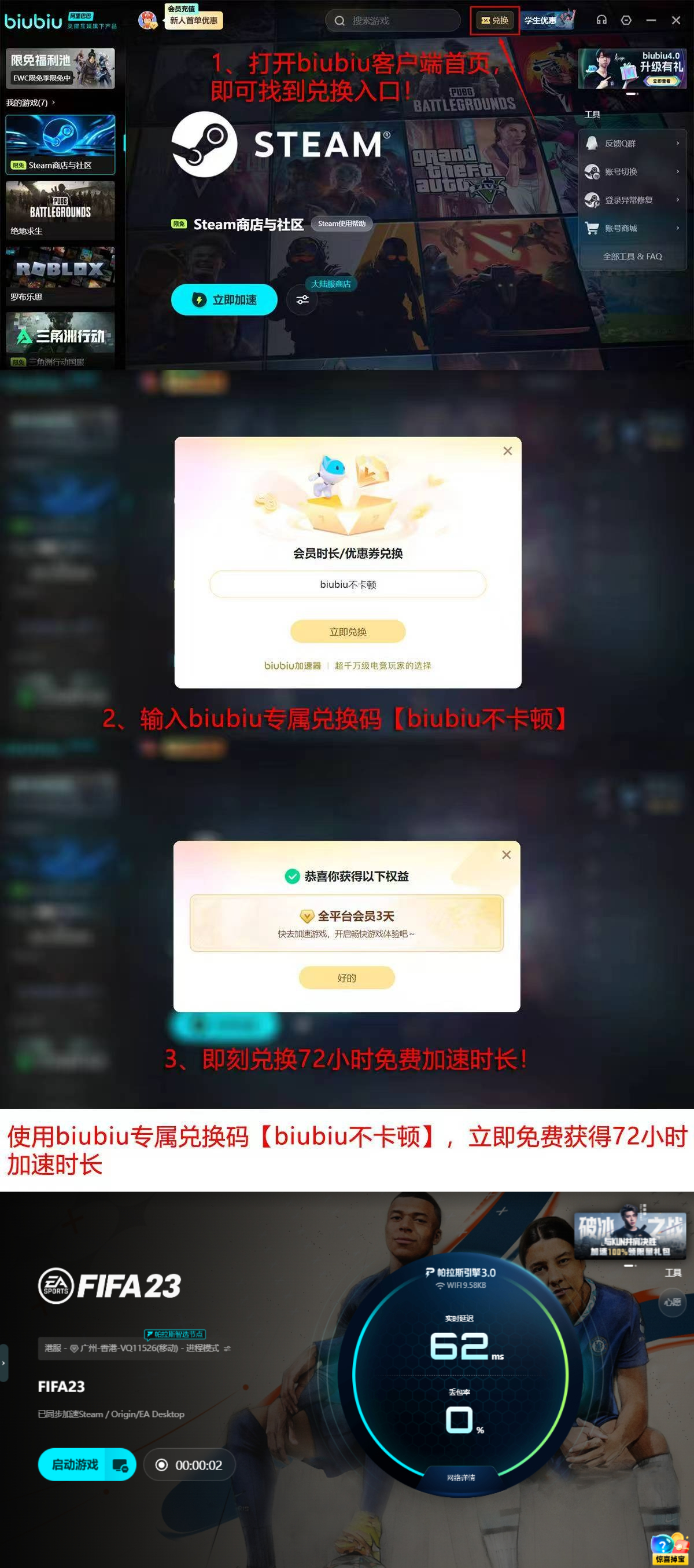 新用户注册后可立即获得首日24小时全功能免费使用权;输入激活码【biubiu不卡顿】,还可额外解锁72小时高级会员权限,两项权益叠加总计享96小时无限制加速服务,覆盖完整新手适应周期。