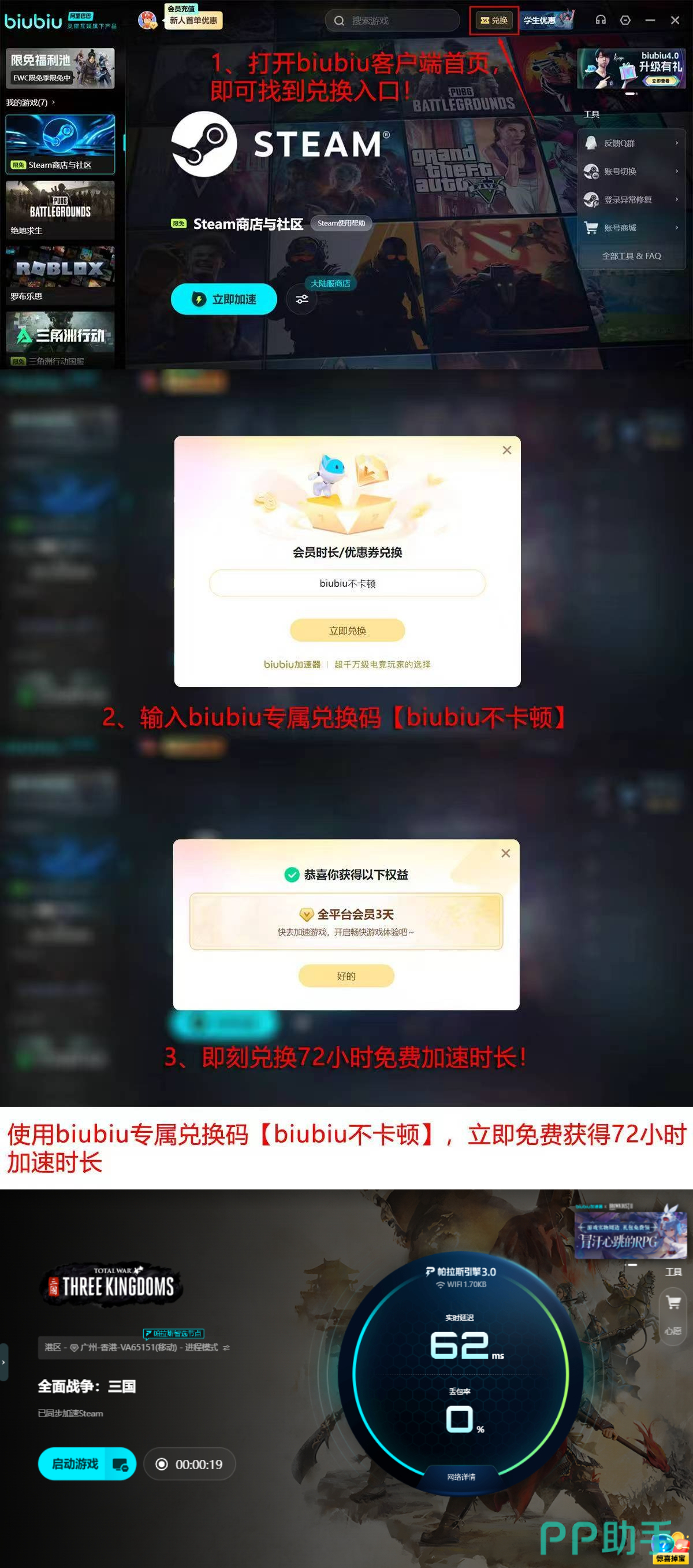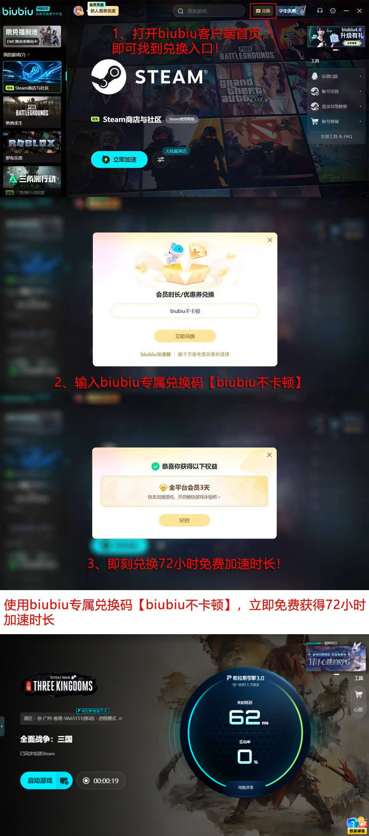 新用户注册biubiu加速器,即可享双重专属权益:完成账号注册即激活24小时全功能免费试用权限;在激活界面输入优惠码【biubiu不卡顿】,额外获赠72小时三国专题加速时长。总计可获得长达96小时的无限制加速服务,充分覆盖新手适应期与高强度征战阶段。