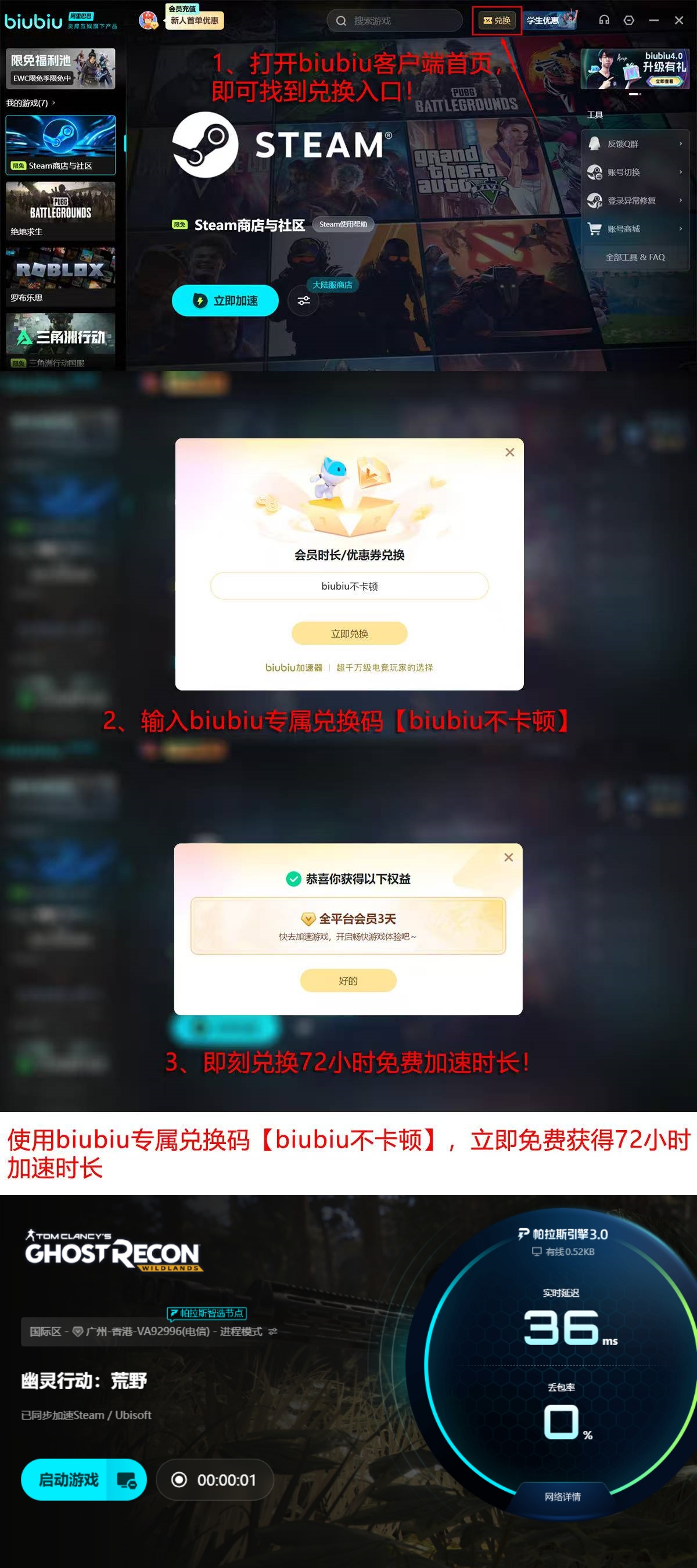 目前新用户注册即赠24小时基础加速时长;老用户及新用户均可凭“biubiu不卡顿”的“暗号”额外领取3天免费加速权益。两项叠加后,用户可累计享有96小时无门槛加速服务,零成本体验稳定低延迟网络环境。
