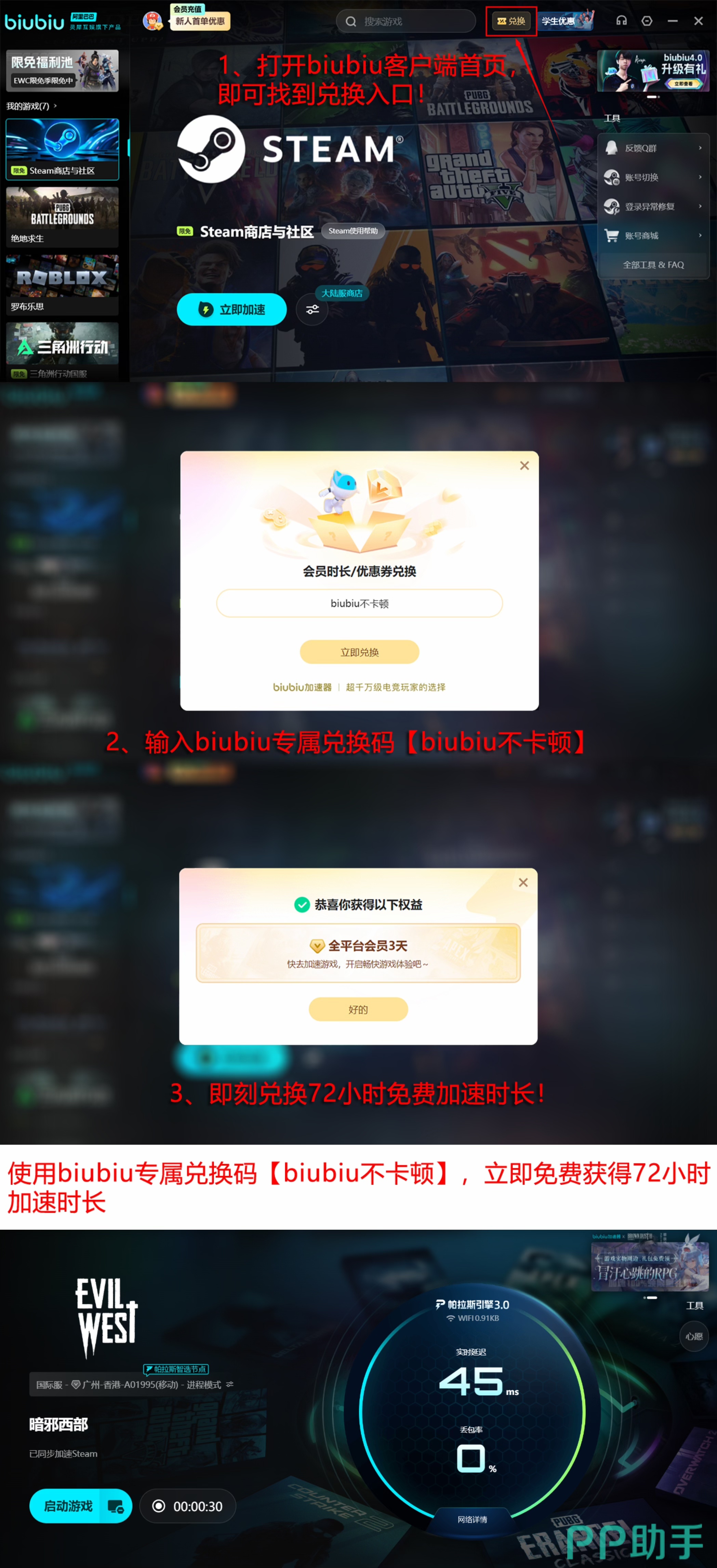 除加速能力外,优质加速服务还需兼顾用户支持效率。biubiu内置Biu仔AI智能客服系统,支持7×24小时即时响应常见技术问题;同时配备人工客服通道,确保复杂故障可获得一对一专项处理。新用户完成注册并登录后,即可自动领取24小时全功能免费加速时长;所有用户输入专属口令【biubiu不卡顿】,均可额外激活3天高级加速权限。
