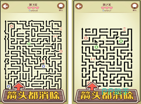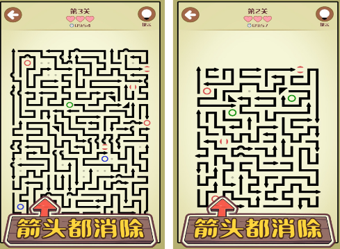 涵盖超多关卡,如果能够根据每一个关卡中所设置的迷宫,甚至是箭头,将其全部都消除的情况下就可以完成挑战,最主要的特点就是玩家需要单手操作,在规定时间内完成。最初的时候由于里面的箭头数量特别的多,每一个的位置都是不一样的,所以必须要根据箭头沿着的方向正确移动屏幕,就能够进行消除,有创意的玩法。