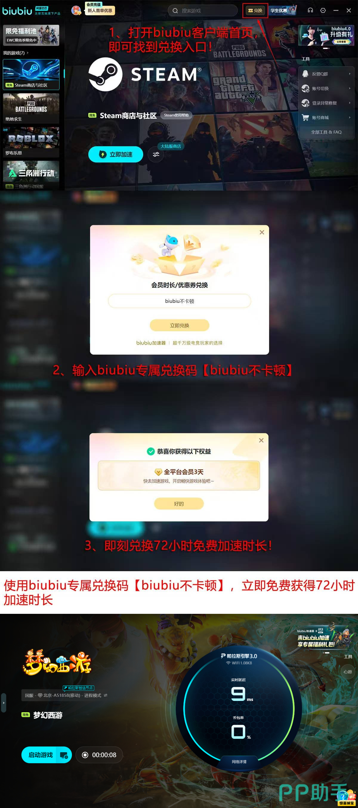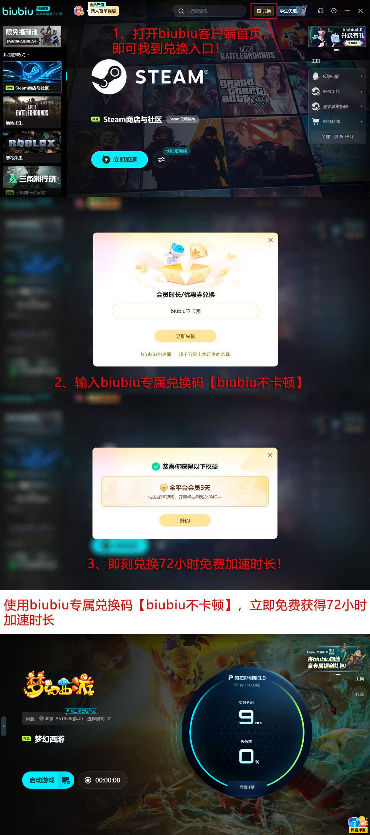 新用户注册biubiu加速器即可激活首日24小时全功能免费试用权限,输入专属口令【biubiu不卡顿】可叠加72小时加速时长,总计享96小时无限制加速服务,即刻感受《梦幻西游》零感知加载、无缝切图、指令瞬发的沉浸式体验。