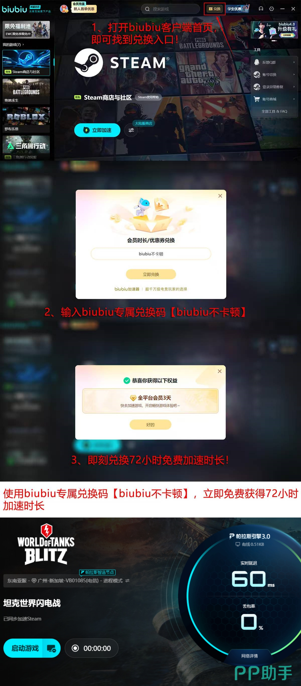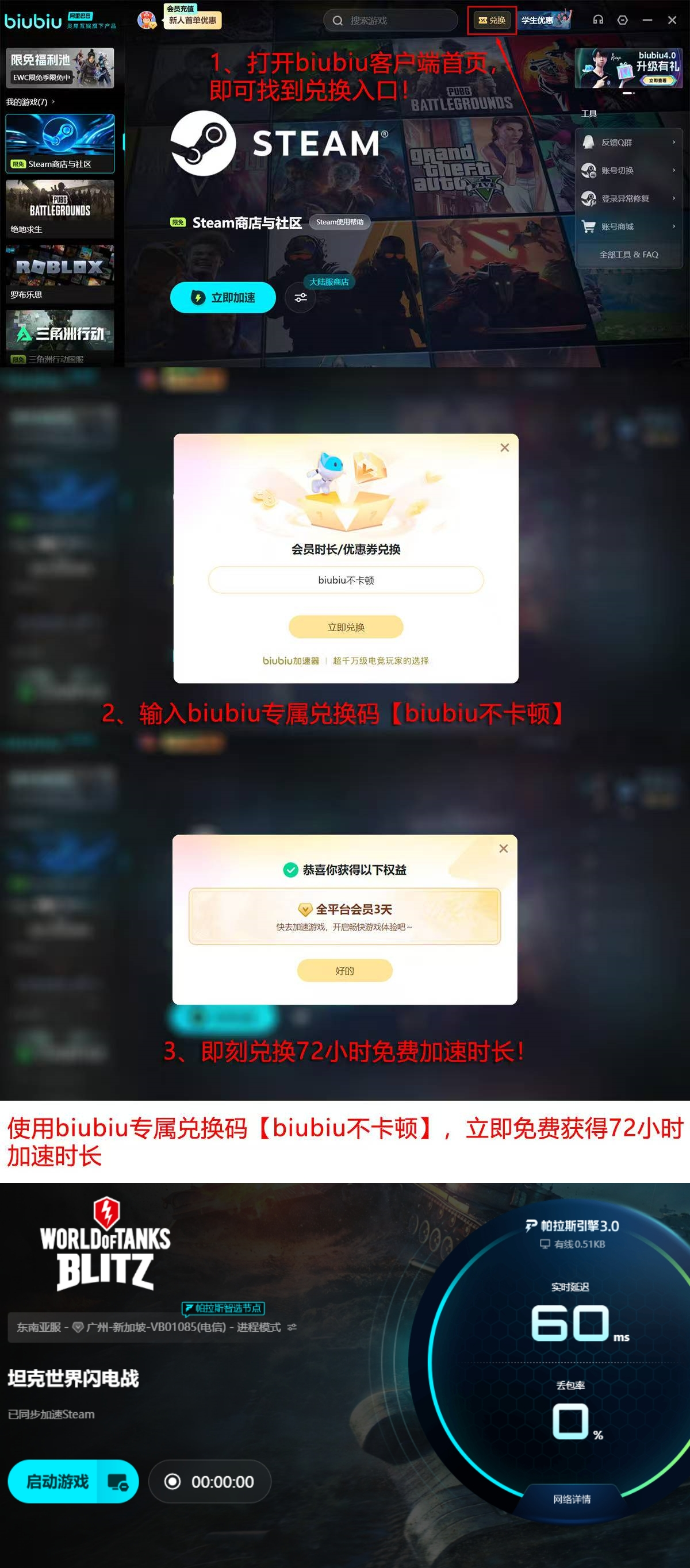 除性能优势外,biubiu加速器同步提供高价值用户权益:输入兑换码【biubiu不卡顿】,即可激活72小时全游戏通用加速时长;新注册用户额外获赠24小时专属加速权限,累计达96小时免费体验周期。该福利组合目前处于行业高位,有效降低玩家初期使用门槛,兼顾实用性与性价比。