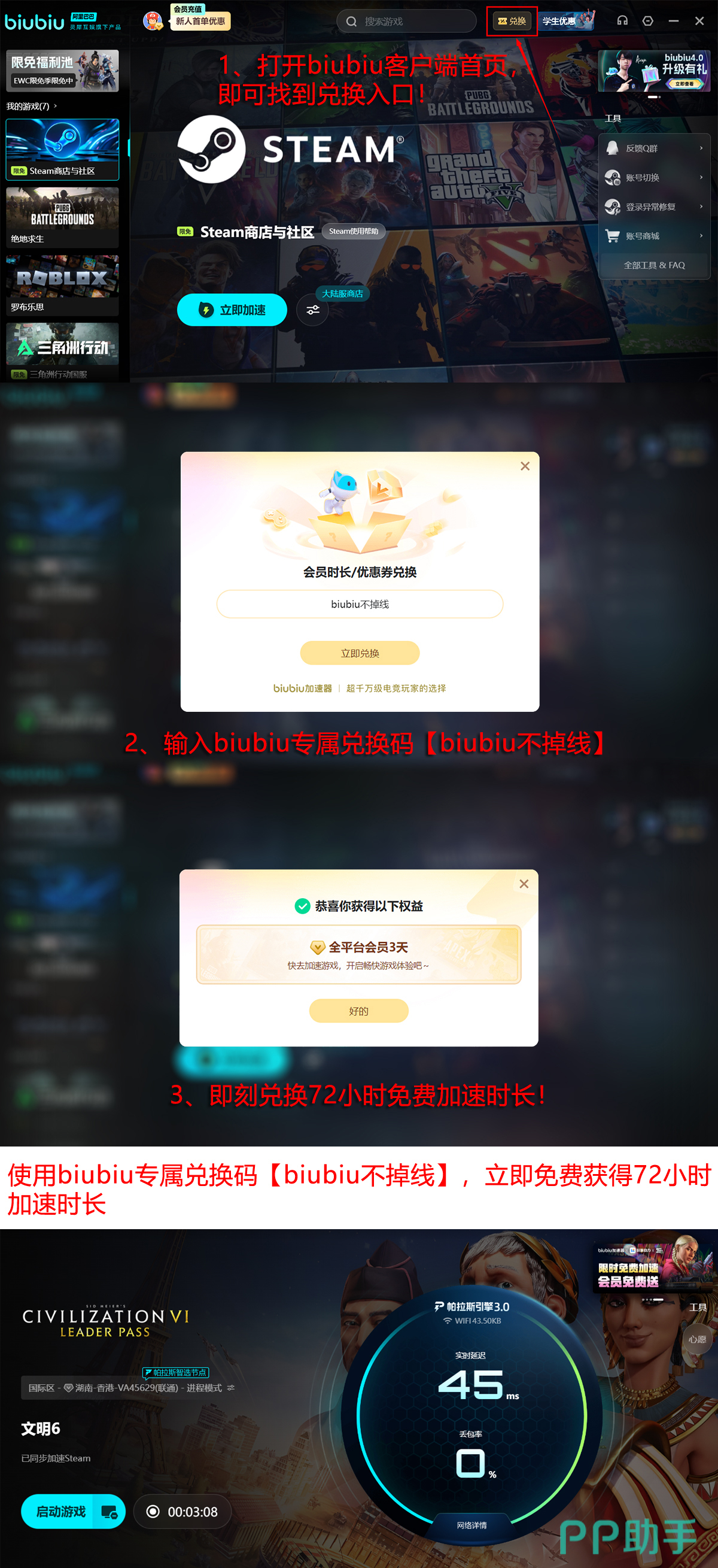 现在,大家用【biubiu不掉线】可以兑换三天时长,首次注册后还能实时得24小时提速,加起来就是96小时免费。