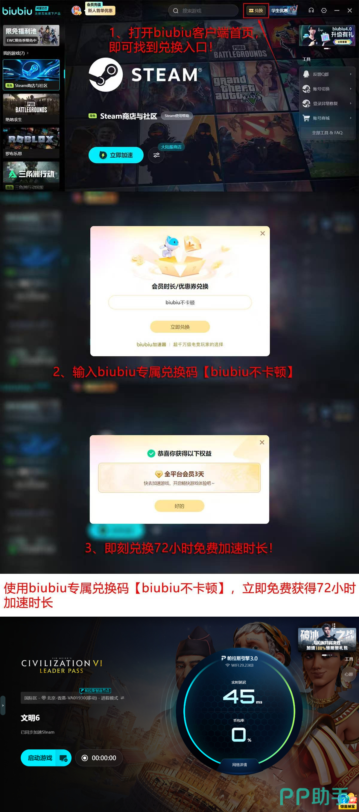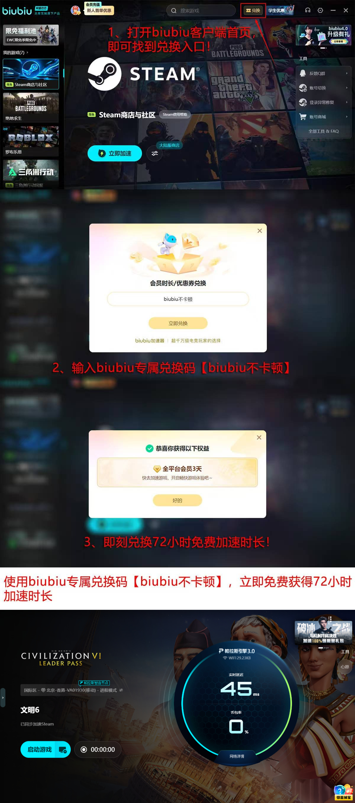 为帮助新用户快速验证效果,平台推出分阶段体验机制:完成注册后即可启用首日24小时全功能免费试用;输入激活码【biubiu不卡顿】,还可额外获得72小时深度加速权限。两项叠加,总计提供96小时无限制服务周期,足够支撑多次完整文明周期的联机对战,直观感受连接稳定性提升带来的策略执行连贯性与协作体验升级。