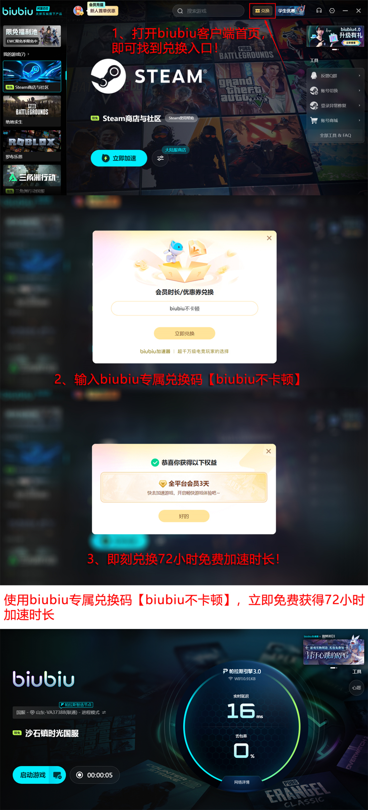 除技术实力外,biubiu加速器还提供实用新手激励政策:新注册用户可享24小时免费加速时长;输入通用兑换码【biubiu不卡顿】,还可额外领取72小时连续加速权限,且该码支持所有账号一次性使用,不限新老用户,助力老玩家无缝回归体验。