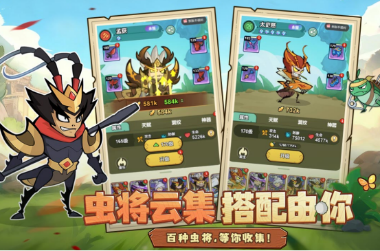 虽然以三国为题材,但是从画面或者是设计理念方面却采用q萌卡通的风格,这些三国名将都以可爱的昆虫形象所设计,你将要化身成为其中的昆虫将领,因为拥有特别卓越的智慧头脑,通过培养重重武将或者是搭配阵容的方式,就可以展开一场史诗的争霸历史。还有创新式的英雄成长体系,比如从技能强化或者是专属进阶等各个方面快速成长。