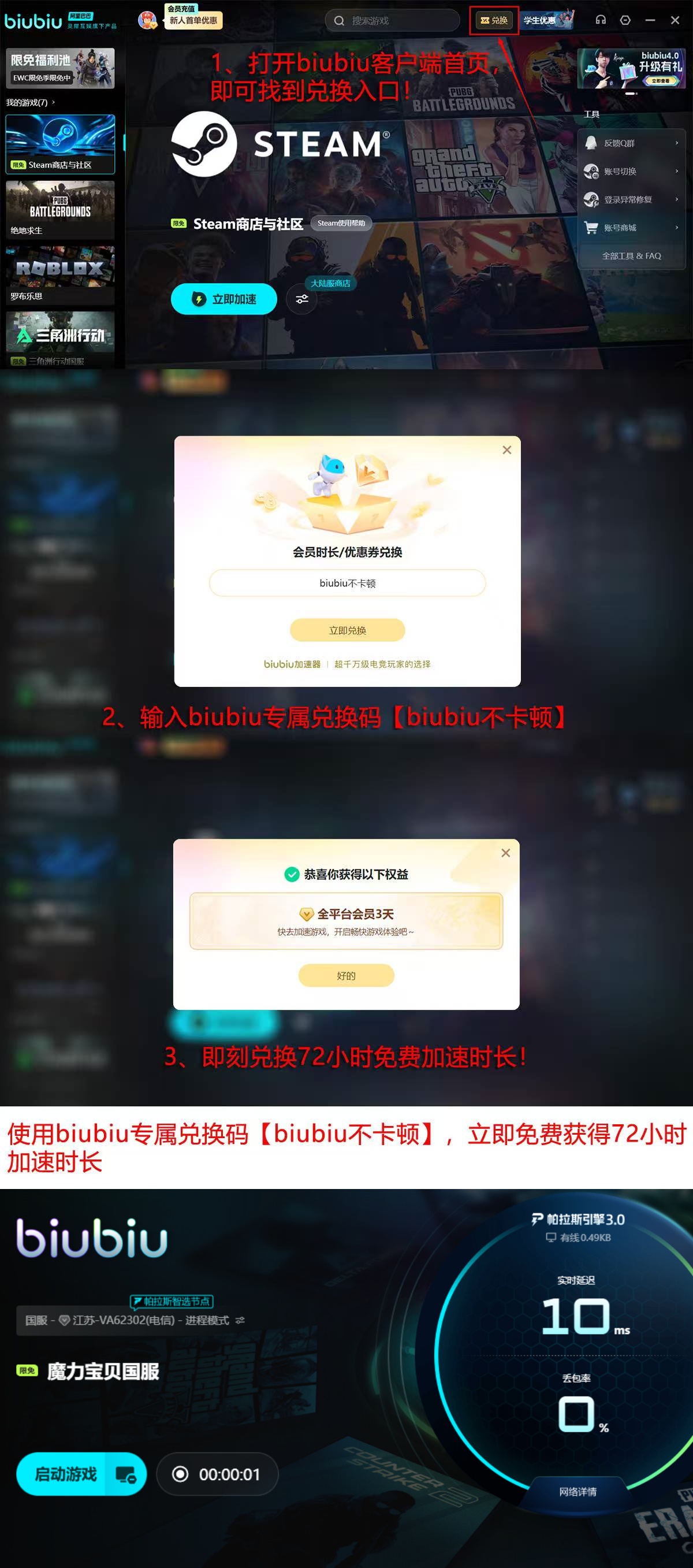 面向新注册用户,biubiu提供24小时全功能免费试用权限。若需延长体验周期,可在激活界面输入专属兑换码【biubiu不卡顿】,即可额外获得3天连续加速服务,无需绑定支付方式。