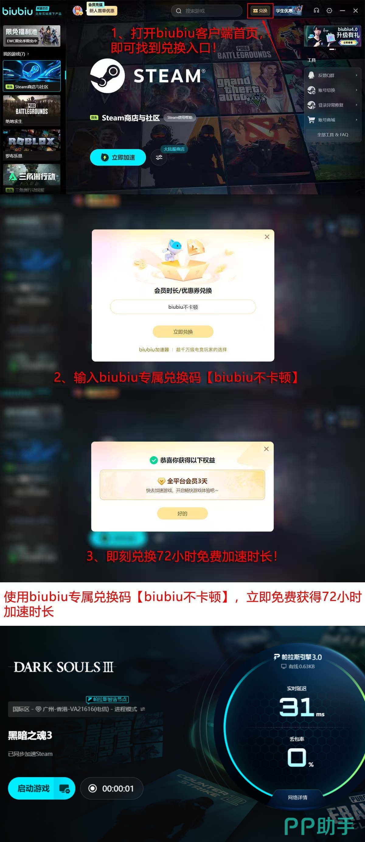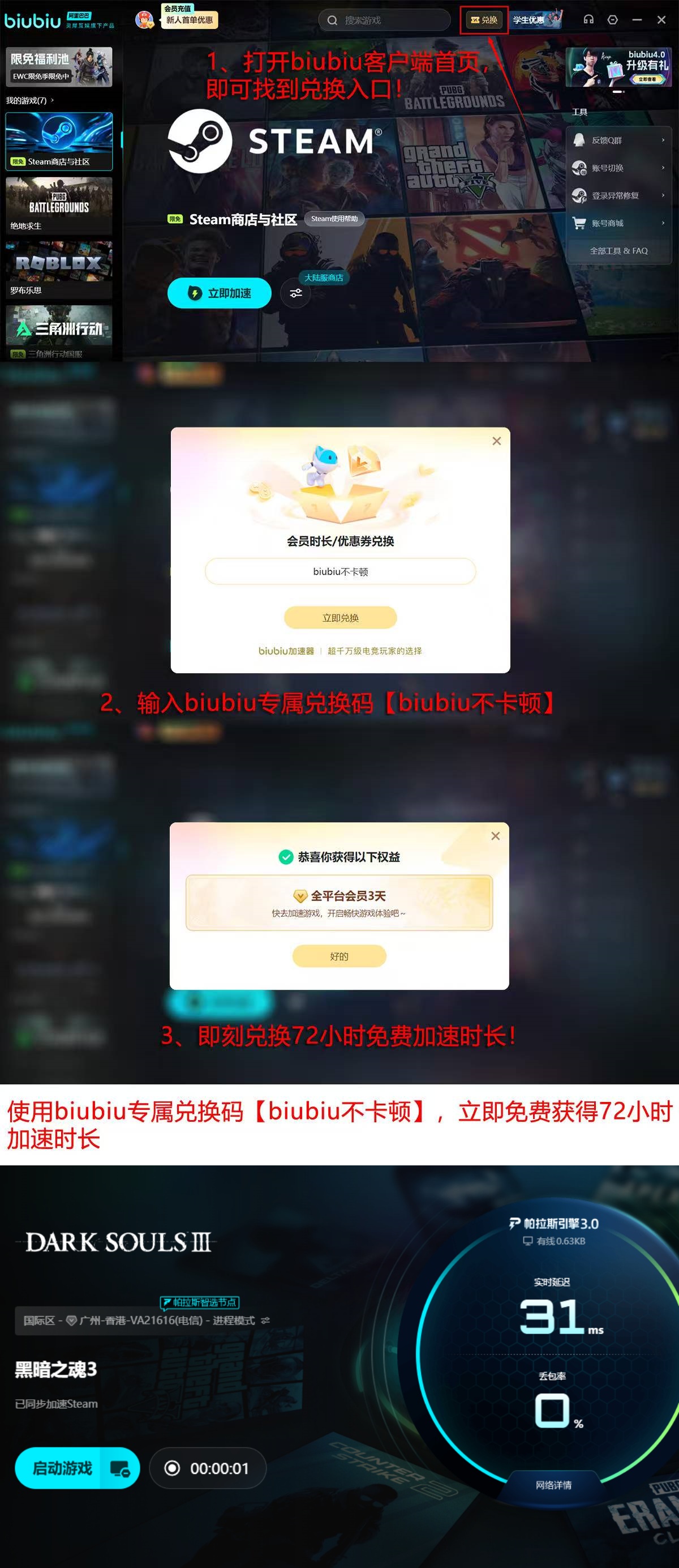新用户注册后可直接获得24小时免费加速时长。输入兑换码【biubiu不卡顿】,还可额外激活72小时连续加速权限,覆盖完整新手流程及关键Boss攻坚阶段。