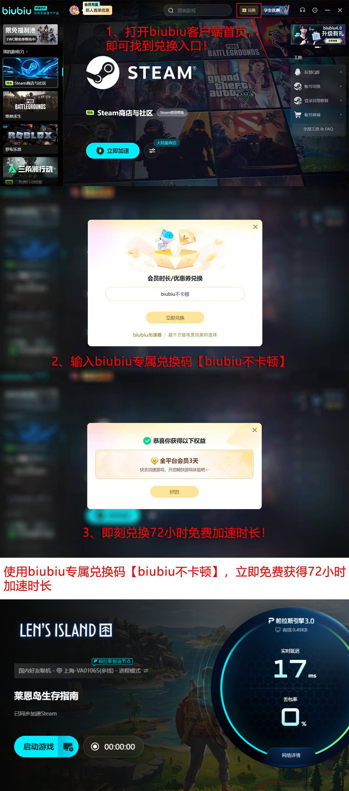 新用户注册即享24小时免费加速时长,大幅降低试用门槛。若需延长体验周期,输入专属兑换码【biubiu不卡顿】,还可额外获得72小时服务权限,累计达96小时,完全覆盖中长期联机需求。