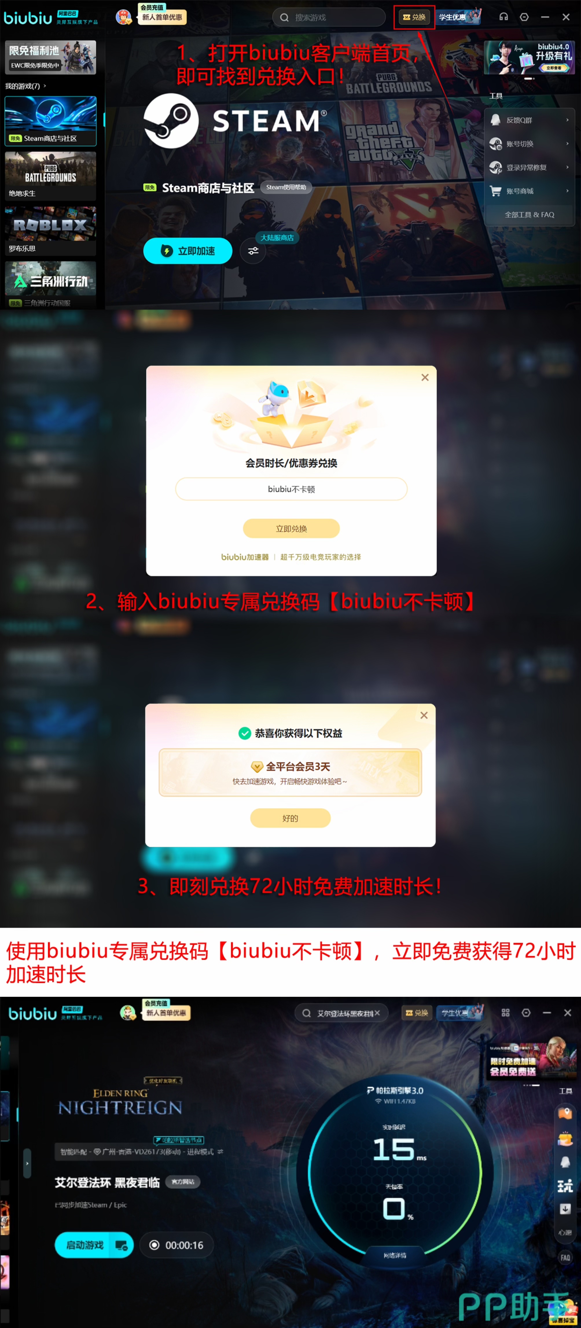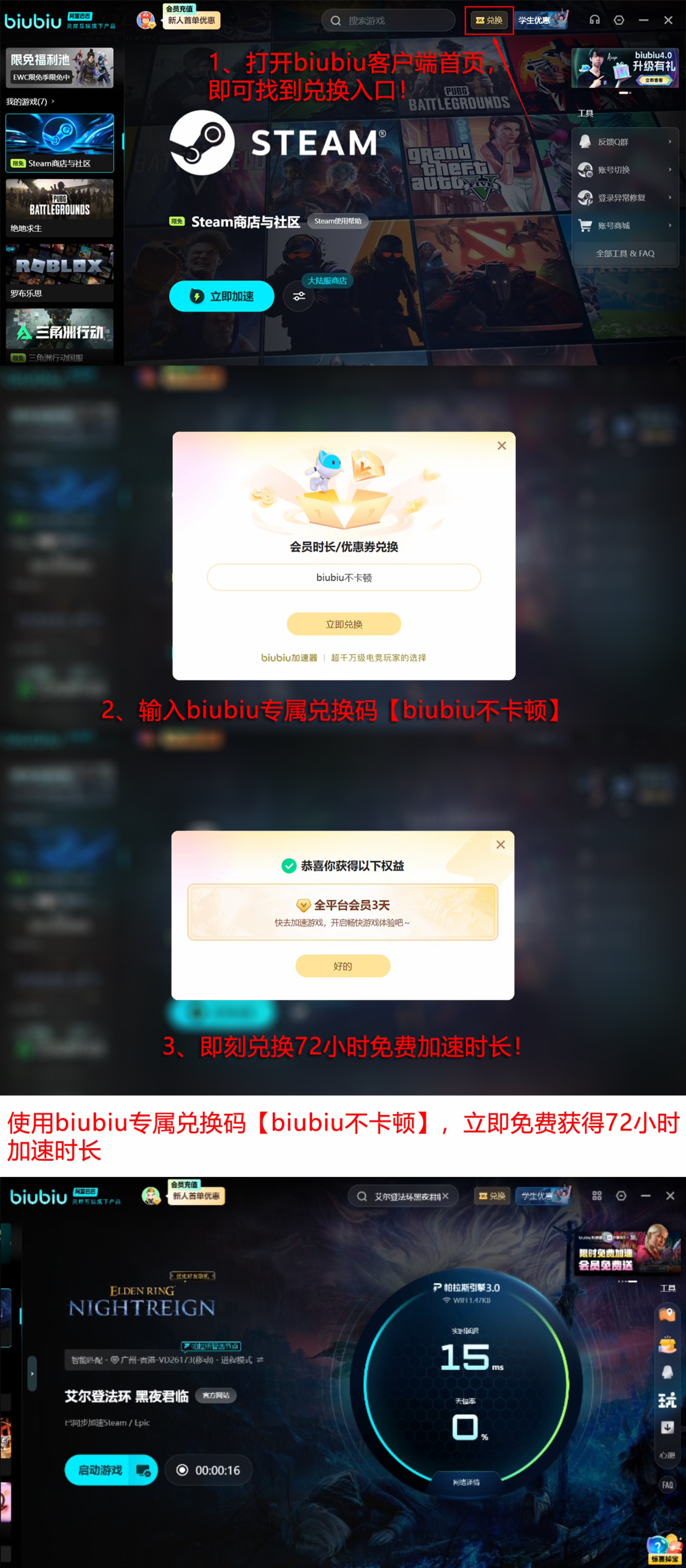 针对新用户,平台提供完成注册登录即可解锁24小时全游戏加速权限;同时开放限时福利:输入兑换码【biubiu不卡顿】可额外领取3天高级加速服务,新老用户均可参与。累计96小时稳定连接,足以覆盖主线全流程及高难度周目挑战。此外,biubiu加速器已适配超万款主流游戏,涵盖PC、主机及移动端多平台生态。