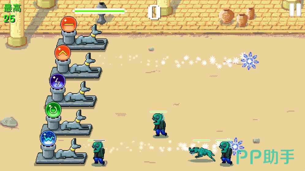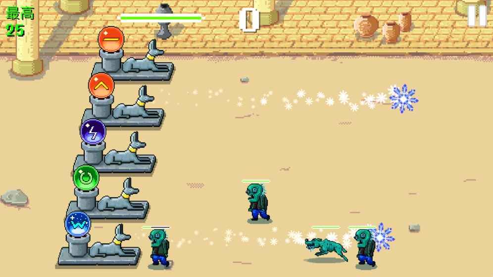 以经典僵尸题材为背景,融合像素艺术与魔法战斗系统。玩家扮演魔法师,通过手指滑动绘制符文轨迹或点击目标区域释放法术。红色法术为单体爆发型,具备高额穿刺伤害与短暂僵直效果;绿色法术为范围持续型,可生成毒雾区域造成多段伤害并降低僵尸移动速度。关卡中设有魔法回路充能机制,合理规划施法节奏与区域覆盖,是应对密集尸潮的关键操作逻辑。