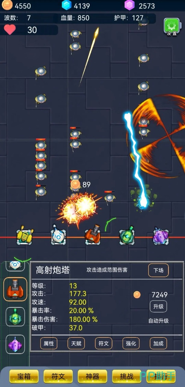 采用极简信息可视化界面,顶部实时同步显示当前波次序号、剩余敌方数量、主城血量及金币储备。所有防御塔严格限定于预设建造点位,不可自由拖拽。每座塔拥有独立属性成长树:基础伤害、攻击频率、作用半径、特殊状态触发率均可定向加点。战斗中可激活符文阵列(如灼烧蔓延、冰霜减速环)与神器共鸣(如雷云覆盖、护盾反射),为固定塔群注入动态增益,实现静态布防与动态调控的双重策略维度。