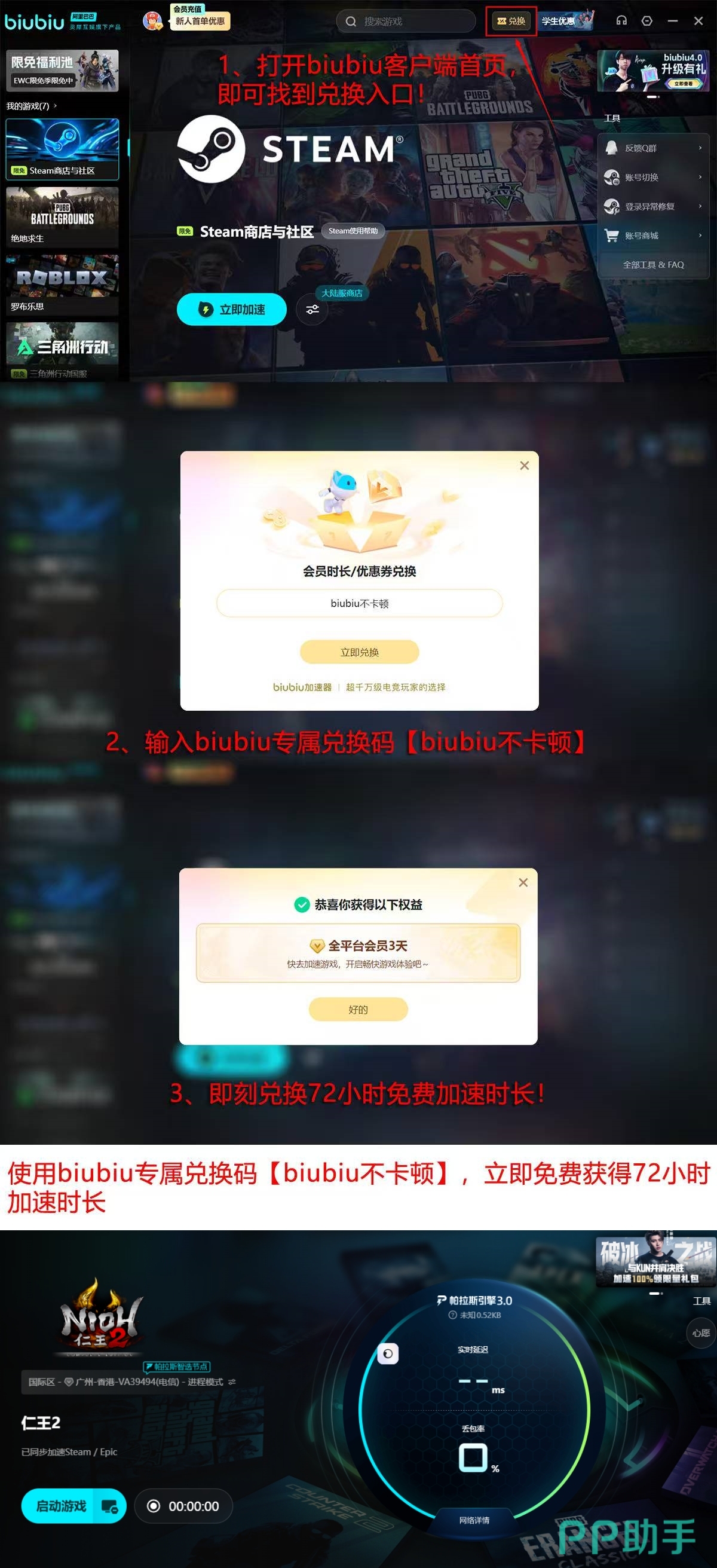 除《仁王2》外,平台已覆盖Steam、Epic及主机模拟器等全生态游戏,支持跨区服智能匹配(含日服、美服、欧服三线并发)。当前新用户专享福利:输入兑换码【biubiu不卡顿】,即可激活72小时全游戏加速权限;叠加首登权益,额外获赠24小时专属时长,总计96小时零成本体验期——此为当前行业唯一提供百小时级免费试用的加速服务方案。