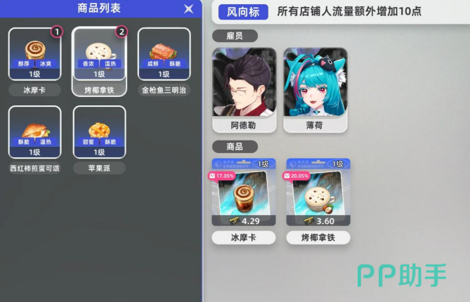 等店铺升到2级之后,苹果派和咖啡就可以捆绑销售了,把这两样拖到收银台的组合货架上,能明显提高连带购买率。哈索尔这个员工升到3级,就能解锁咖啡大师的分支技能,这个分支里面有个金杯萃取的技能,建议优先点满。虽然前期投入的技能点数比较多,但是效果很明显,精品咖啡的售价能提高零点四五元。