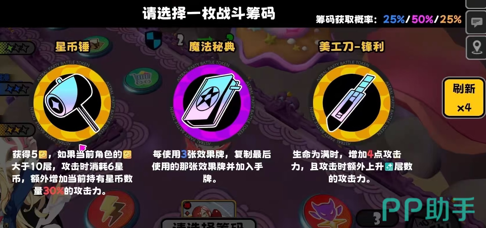 筹码按品质划分为蓝、紫、金三档,对应基础、进阶与顶级层级。其刷新概率随玩家当前星阶动态变化:低星阶段蓝色筹码出现率超65%;中星阶段紫色成为主力,金色概率提升至20%;高星阶段金色刷新率显著上升,成为主流选择。该机制确保玩家成长曲线与资源获取节奏高度匹配。