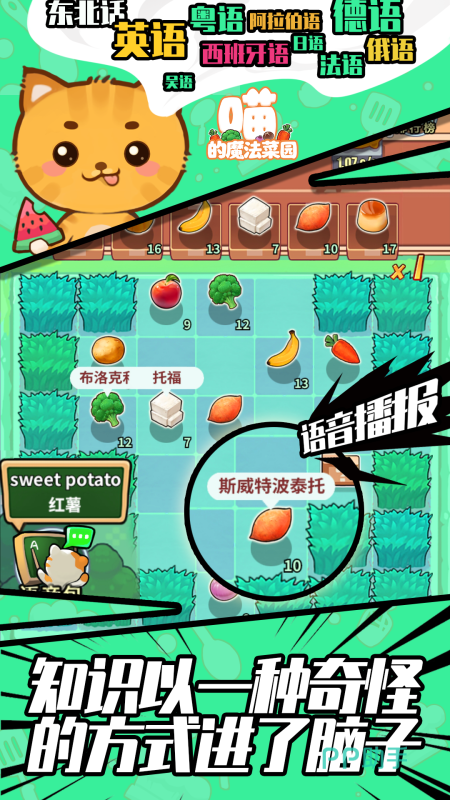 玩家要和可爱猫咪共同经营这片菜园,种植香菇、土豆等日常农作物超过数十种,日常签到做升级任务,有随机掉落礼盒制造惊喜。可升级解锁雇佣多个打工小猫为玩家打工服务,点击每款农作物,即可查看多国语言的翻译,活泼且可爱。