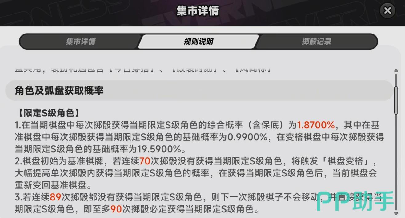 《异环》采用独创的大富翁棋盘式抽卡界面,区别于传统转盘或滚动列表设计,在当前二次元手游市场中具备明显差异化优势。该角色限定卡池实行“不歪保底”规则——即只要抽出最高稀有度(S级)角色,必定为当期UP角色,杜绝“歪到常驻”的情况。整体综合出货率为1.87%,其中前70抽的基础单抽出货率为0.99%;自第71抽起触发软保底机制,单抽出货率跃升至19.5%;且明确设置90抽硬性保底,确保玩家在该抽数内必得当期限定角色。此外,不同限定卡池间共享保底计数,历史抽数可跨池继承,大幅降低重复抽取成本。