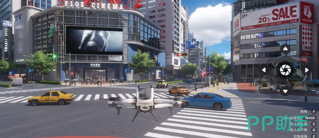 启动无人机操作十分便捷:只需点击屏幕中醒目的【无人机】图标,即可切换至自由飞行视角。在该模式下,玩家可通过虚拟按键精准控制飞行高度,并实时调节镜头俯仰与水平旋转角度,实现多角度构图与动态运镜。