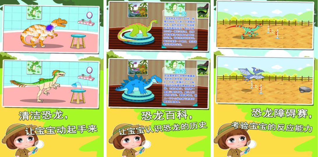 这是个给小朋友们开发的恐龙知识模拟教育游戏,可以为恐龙清洁身体或者参与各种互动任务,卡通风格的恐龙给小朋友一种极高的代入感,多种多样的恐龙主题知识会丰富孩子的认知,恐龙养成和障碍赛模拟这类玩法互动性拉满,考验玩家们反应力和互动性的游戏概念也相当有趣,你也与孩子一起掌握一些恐龙方面的知识吧。