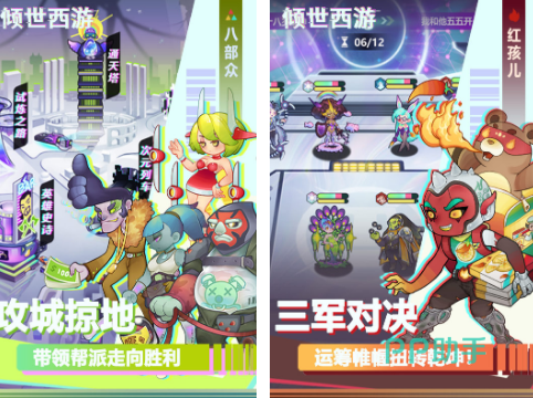 具有赛博画风,以及融入了西游题材的放置类型手游,还属于一款比较好玩的回合制游戏,你将看到超多炫酷赛博元素,以及各种能力不同的英雄。伴随着跌宕起伏的故事,在每一次回合制战斗的时候,可以领略不同的故事,也能不断成长。所有的西游角色都以一种卡通的风格打造,这是三军之间的对决。还有百变的技能可以进行组合。