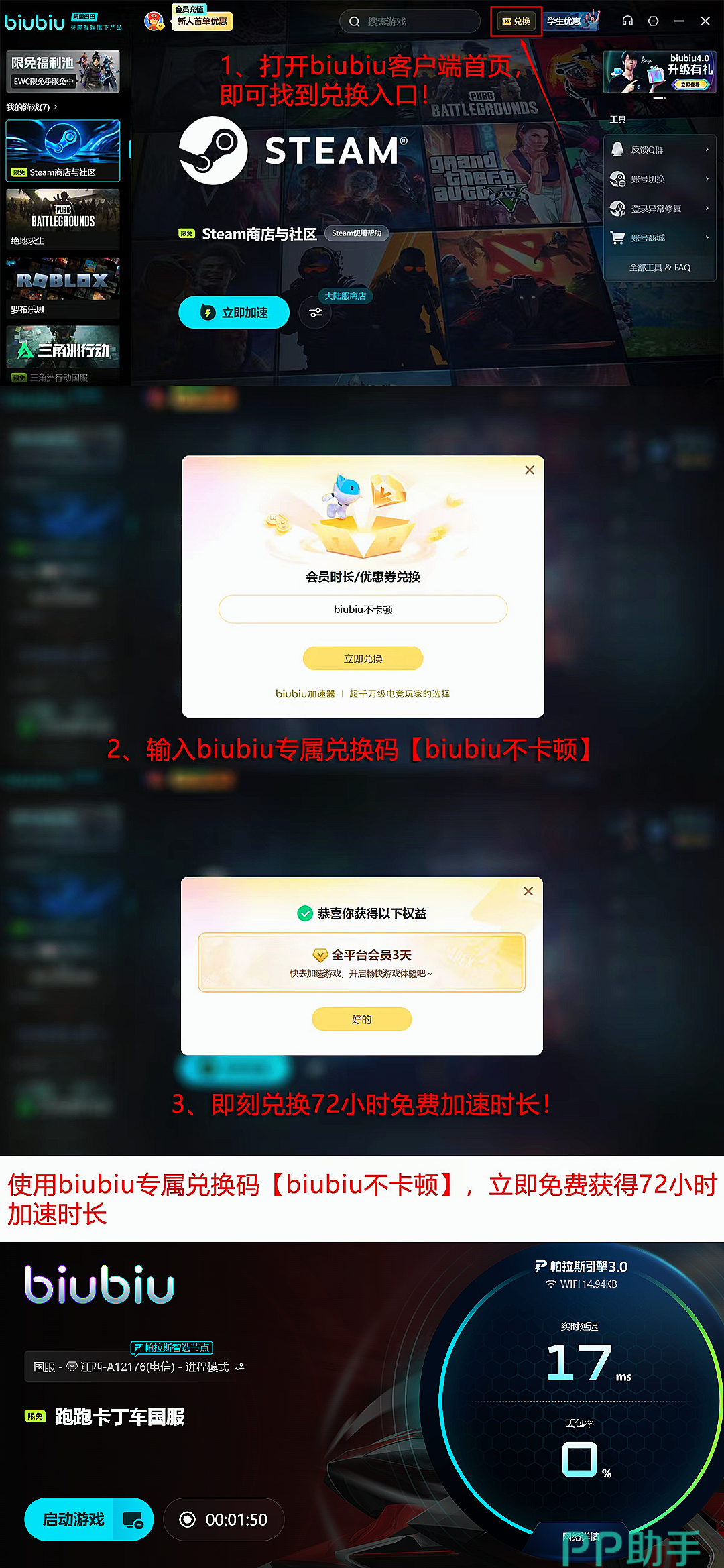 同时平台为玩家准备了贴心的加速福利,新用户完成注册后无需额外操作即可直接领取24小时全场游戏免费加速,所有用户无论新老,只需输入兑换码【biubiu不卡顿】,便能额外再领取3天免费加速时长,这意味着新用户可以累计获得96小时的免费加速哦。