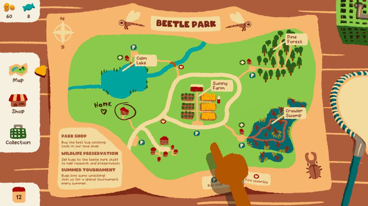 在在夏日公园当中捕捉可爱小虫,满足每一位虫虫爱好者。和收集达人的小小癖好,可爱的手绘漫画风格300+种不同的昆虫,从独角仙到蜻蜓,可以任你自由捕捉,在这里你还可以解锁小小商店,在其中购买捕虫网、捕虫诱饵等等,将这些小虫子们训练这的更强,赢得夏季甲虫冠军!