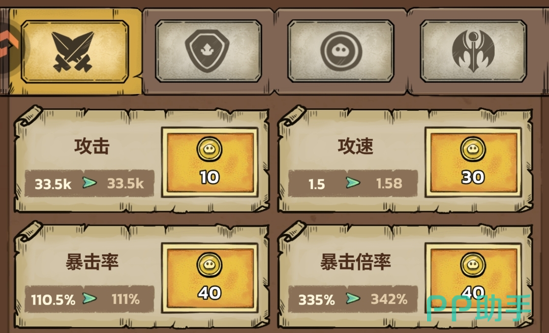 首日金币应集中用于解锁并强化攻击、攻速、攻击范围(需400金币)、减速概率(需600金币)及双重攻击几率(需2000金币)。攻速建议提升至3.0,攻击范围升至20后暂停;攻击属性仅需满足两击秒杀小怪即可,其余资源优先堆叠双重攻击几率与减速概率,满级后再补足攻速、范围与攻击。其余天赋暂不投入。