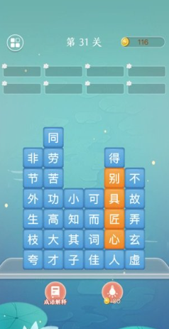 游戏中,大家可以在成语和古诗词两种模式里自由的切换,它的关卡设计的非常的巧妙,难度也是不断增加的,从大家平时常用的词语过渡到一些不常见的,游戏里有很多四字成语,系统会自动生成不同的卡关卡内容,每一个成语都有特别详细的解释,用大白话讲的非常清楚,大家在玩的时候需要盯着一个成语的最后一个字,赶快在脑子里想一下,反应需要很快。