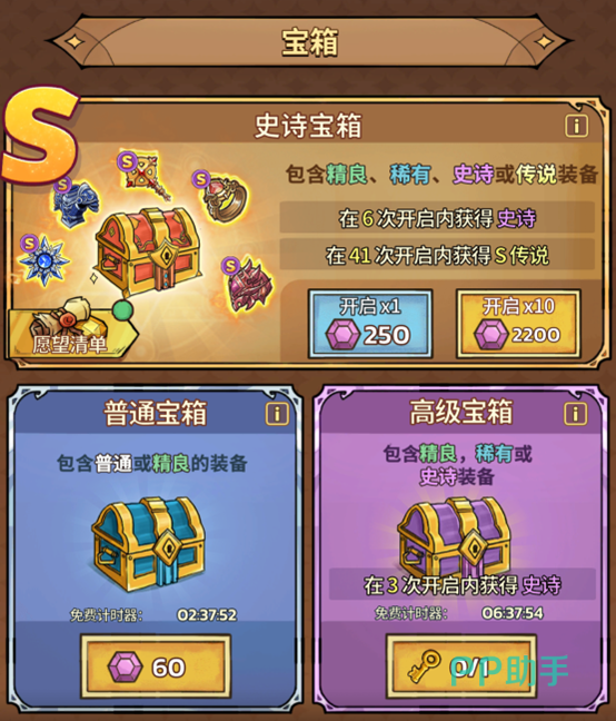 宝箱/抽卡:游戏商店中有各种宝箱(普通、高级、史诗)用钻石进行抽取。这是获得高品质(橙、红)装备和完整套装的主要途径之一。