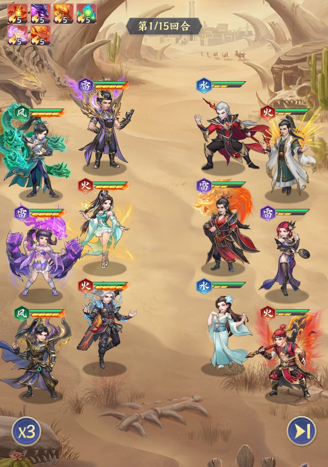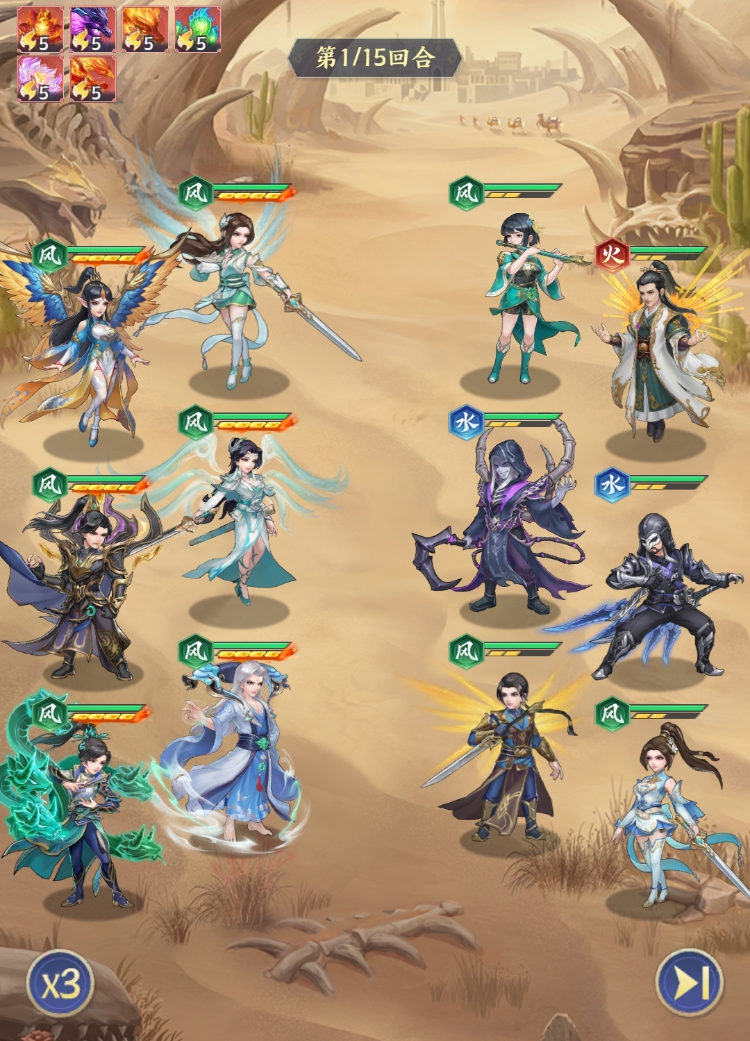 风系追击队是全由风系角色所组成的阵容,上阵角色为纳兰嫣然、云韵、云山、风清儿、青鳞和古青阳。先手由纳兰嫣然为敌方纵排挂上破绽,提高2号位云韵的伤害,方便她触发技能的击杀追击,再由3号位的云山用自己的单体高爆发解决高血量的敌人,最后由风清儿补伤害完成对敌方全体的收割,是技能循环很流畅的一套体系。再加上队伍里还有青鳞和古青阳提供保护,使得本阵容的生存能力也很优秀。