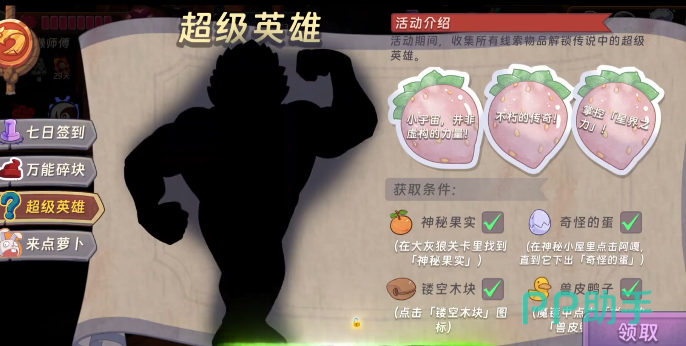 要想解锁卡皮巴拉,那就需要完成超级英雄的专属活动任务。要凑齐4个关键的物品,而这4个关键的物品难度并不相同,其中镂空木块获取的方法是比较简单的。玩家只需要将游戏内的活动界面打开,然后找到超级英雄的任务板块,在左下角就可以看到有镂空木块的图标。并不需要复杂的操作,点击一下图标就能完成操作。系统就会自动打勾确认,所以说这就是送分的,大家千万别错过这个收集。