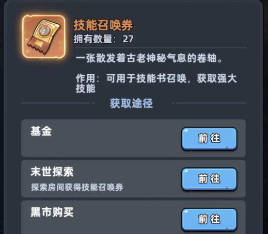 但关键就在于要开通技能书基金,每一次角色在进阶时全部都可以获得固定技能书,这就等同于是白嫖奖励。另外,不要错过末日世界探索,在世界地图里面,只要是有开启门图标的房间,走进去之后就可以获得召唤券。黑市虽然可以直接买,但是一张要150钻石还是比较肉疼的,建议等到后期钻石足够充裕之后,再考虑。另外一个路,那自然就是通过场景探索获取。虽然室内探索主要是获得召唤券,但在高难度节点中还是有机会获得完整的技能书,尤其是限定款。运气好的话,就可以少走很多的弯路。
