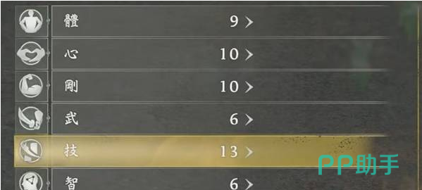 角色能力值可在任意篝火处自由重置并重新分配,全程无需消耗任何道具或资源,操作零成本,调整无压力。各属性具体作用如下:“体”——决定基础HP总量,并同步提升长枪、斧头、锁镰、旋棍四类近战武器的基础攻击力;“心”——影响体力上限、精力上限以及精力自然恢复速率,同时关联太刀、双刀、长枪、忍双刀、手甲的攻击力,部分远程武器的伤害也受其加成;“刚”——提升负重上限与体力值,对斧头、大太刀、手斧、手甲四类高耗能武器的伤害有直接增益;“武”——专精于近战输出强化,覆盖太刀、双刀、斧头、大太刀、忍刀、旋棍六种武器类型,是构建高爆发流派的核心属性。